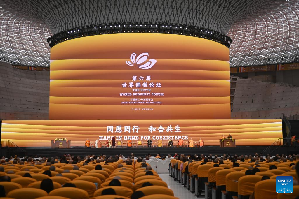 NINGBO, 16 octubre, 2024 (Xinhua) -- El foro principal del sexto Foro Budista Mundial se lleva a cabo en Ningbo, en la provincia de Zhejiang, en el este de China, el 16 de octubre de 2024. Representantes de la comunidad budista, expertos, académicos y otros invitados de 72 países y regiones de todo el mundo asistieron al foro principal. (Xinhua/Huang Zongzhi)
