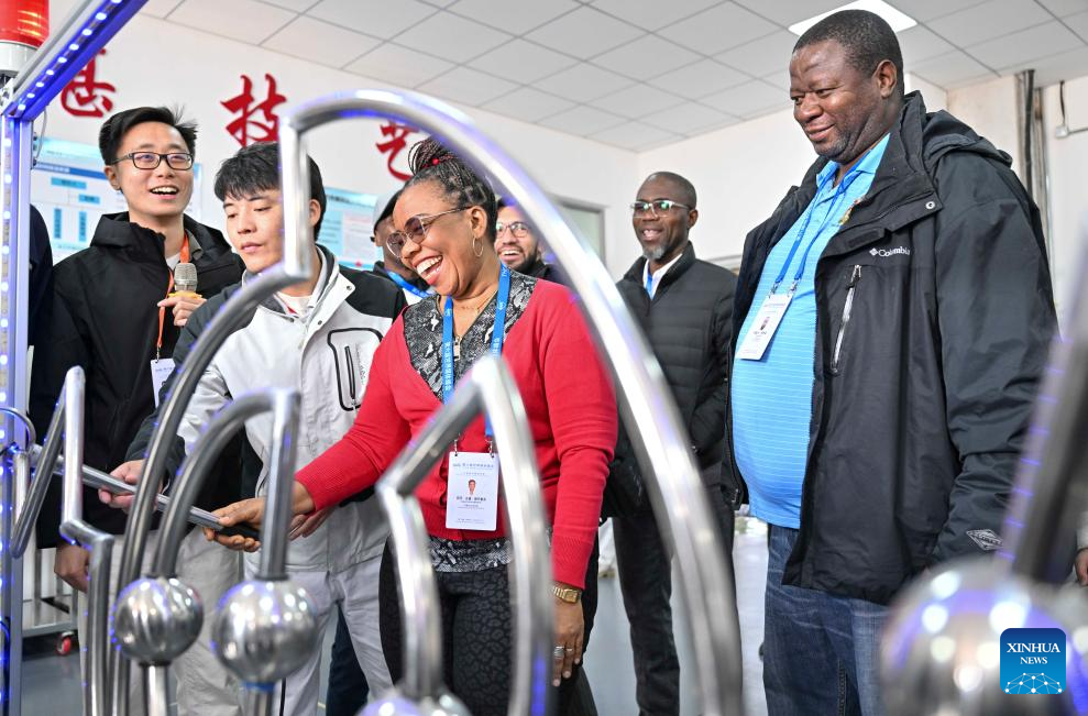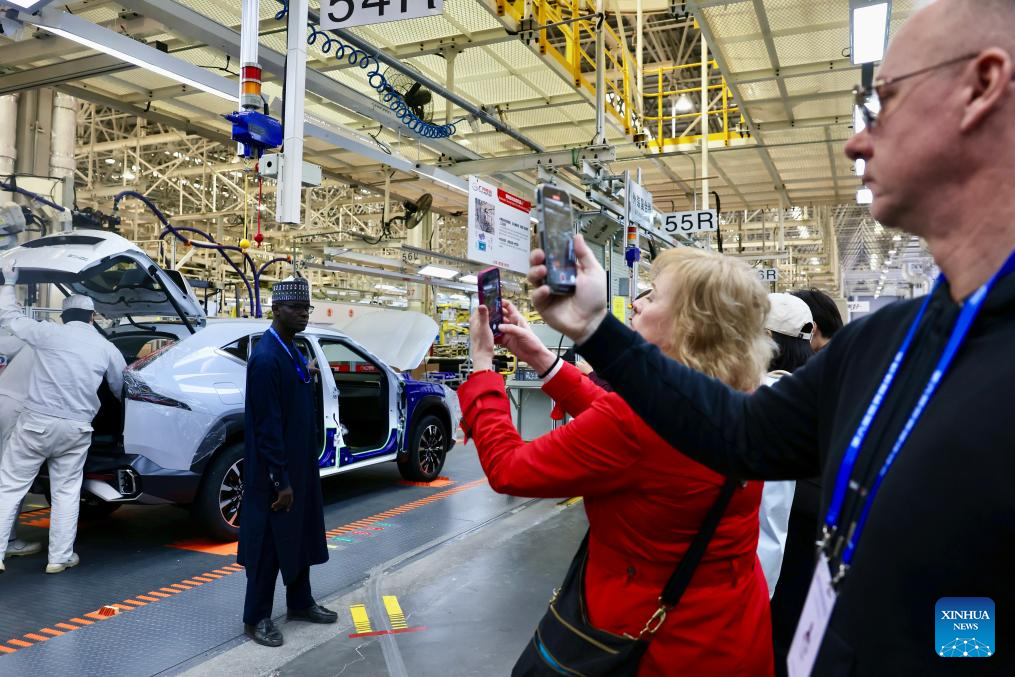 URUMQI, octubre 16, 2024 (Xinhua) -- Asistentes a la VI Cumbre Mundial de Medios visitan una compañía de automóviles, en Urumqi, en la región autónoma uygur de Xinjiang, en el noroeste de China, el 16 de octubre de 2024. La VI Cumbre Mundial de Medios se inauguró el lunes en la ciudad de Urumqi, capital de Xinjiang. Asistentes a la Cumbre visitarán varios lugares en Xinjiang durante el período de la Cumbre. (Xinhua/Wang Fei)