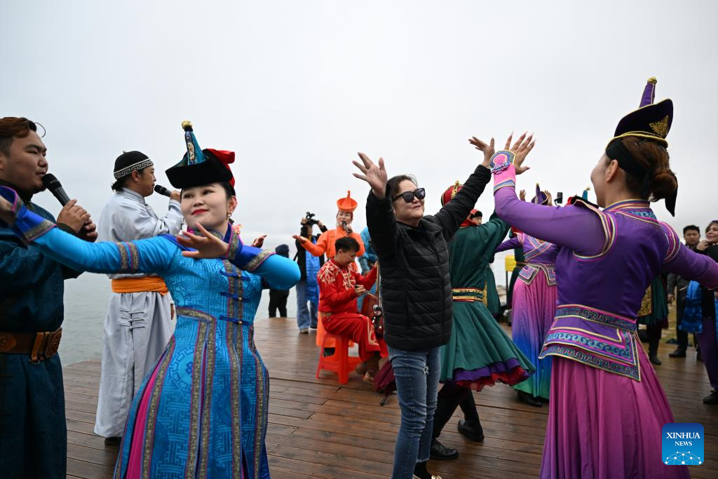 URUMQI, octubre 16, 2024 (Xinhua) -- Asistentes a la VI Cumbre Mundial de Medios bailan con artistas junto al lago Sayram, en la región autónoma uygur de Xinjiang, en el noroeste de China, el 16 de octubre de 2024. La VI Cumbre Mundial de Medios se inauguró el lunes en la ciudad de Urumqi, capital de Xinjiang. Asistentes a la Cumbre visitarán varios lugares en Xinjiang durante el período de la Cumbre. (Xinhua/Mu Yu)