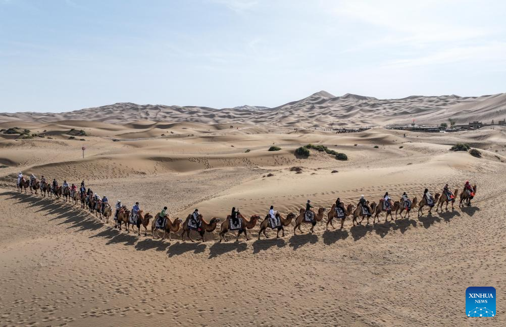 URUMQI, octubre 16, 2024 (Xinhua) -- Imagen tomada con un dron el 16 de octubre de 2024 de asistentes a la VI Cumbre Mundial de Medios experimentando un paseo en camello por un desierto, en Turpan, en la región autónoma uygur de Xinjiang, en el noroeste de China. La VI Cumbre Mundial de Medios se inauguró el lunes en la ciudad de Urumqi, capital de Xinjiang. Asistentes a la Cumbre visitarán varios lugares en Xinjiang durante el período de la Cumbre. (Xinhua/Chen Yehua)