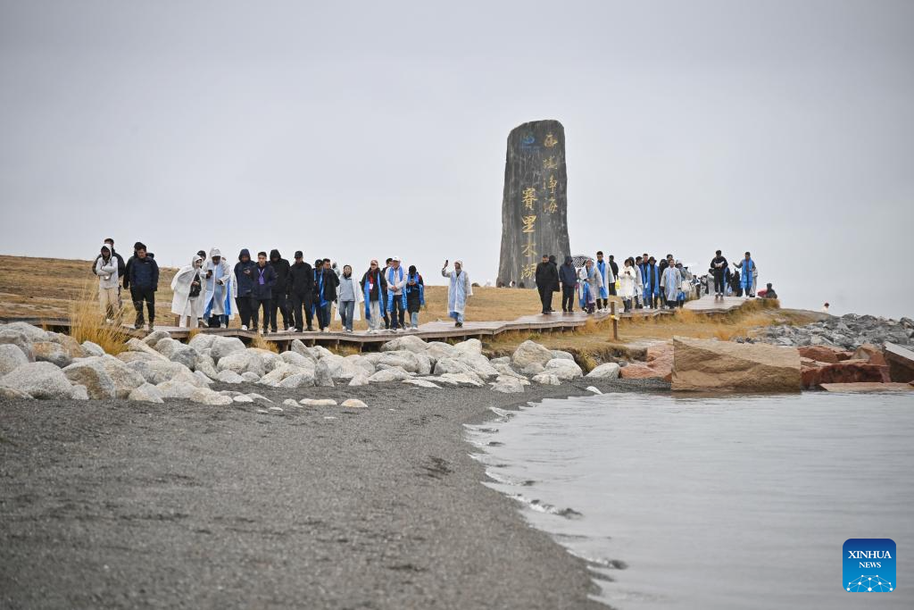 URUMQI, octubre 16, 2024 (Xinhua) -- Asistentes a la VI Cumbre Mundial de Medios visitan el lago Sayram, en la región autónoma uygur de Xinjiang, en el noroeste de China, el 16 de octubre de 2024. La VI Cumbre Mundial de Medios se inauguró el lunes en la ciudad de Urumqi, capital de Xinjiang. Asistentes a la Cumbre visitarán varios lugares en Xinjiang durante el período de la Cumbre. (Xinhua/Liu Xu)