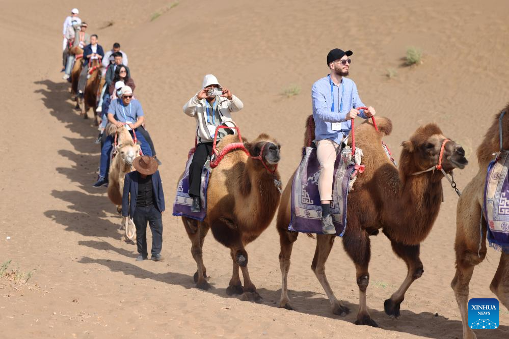 URUMQI, octubre 16, 2024 (Xinhua) -- Asistentes a la VI Cumbre Mundial de Medios experimentan un paseo en camello por un desierto, en Turpan, en la región autónoma uygur de Xinjiang, en el noroeste de China, el 16 de octubre de 2024. La VI Cumbre Mundial de Medios se inauguró el lunes en la ciudad de Urumqi, capital de Xinjiang. Asistentes a la Cumbre visitarán varios lugares en Xinjiang durante el período de la Cumbre. (Xinhua/Li Ming)