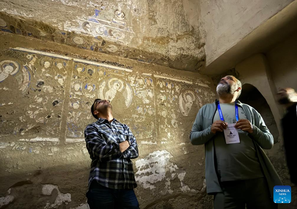URUMQI, octubre 16, 2024 (Xinhua) -- Asistentes a la VI Cumbre Mundial de Medios visitan la Gruta de Kizil, en Aksu, en la región autónoma uygur de Xinjiang, en el noroeste de China, el 16 de octubre de 2024. La VI Cumbre Mundial de Medios se inauguró el lunes en la ciudad de Urumqi, capital de Xinjiang. Asistentes a la Cumbre visitarán varios lugares en Xinjiang durante el período de la Cumbre. (Xinhua/Wei Hai)