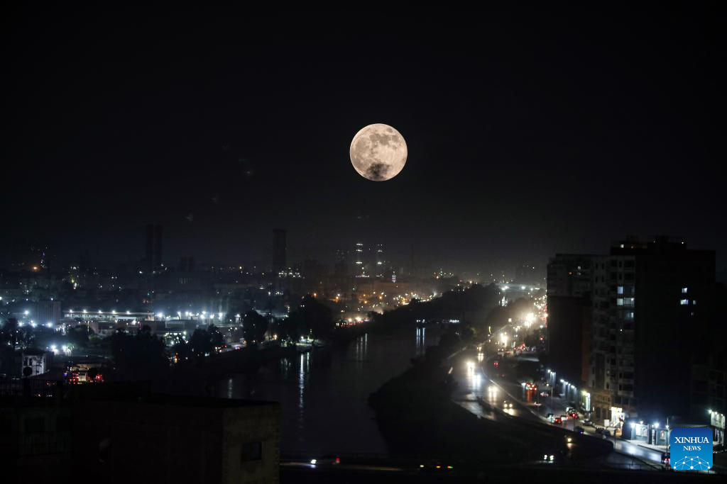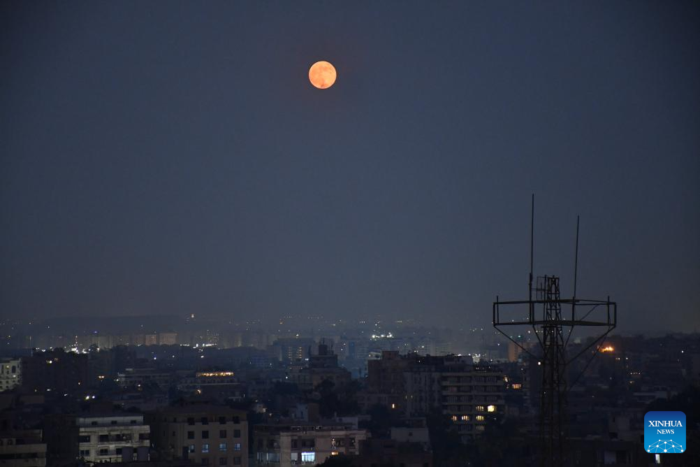 EL CAIRO, 17 octubre, 2024 (Xinhua) -- Una luna llena es vista en el cielo sobre El Cairo, Egipto, el 17 de octubre de 2024. (Xinhua/Liu Minhao)