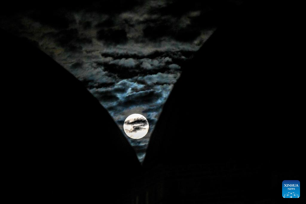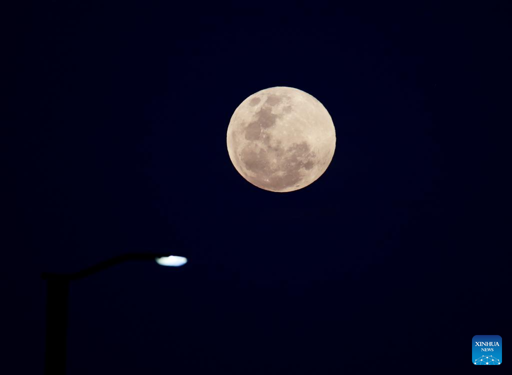 SKOPIE, 17 octubre, 2024 (Xinhua) -- Una luna llena es vista sobre el cielo de Skopie, Macedonia del Norte, el 17 de octubre de 2024. (Xinhua/Tomislav Georgiev)