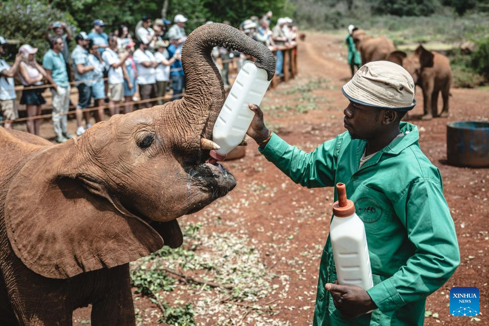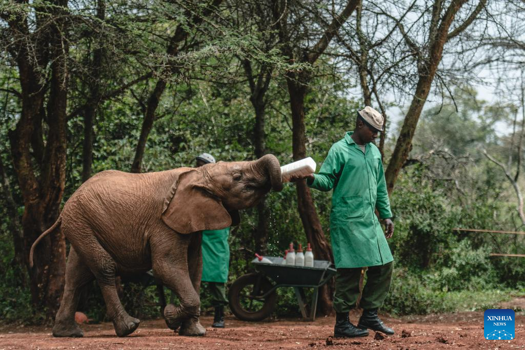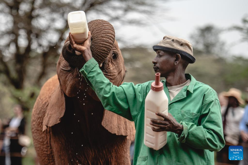 NAIROBI, 17octubre, 2024 (Xinhua) -- Imagen del 16 de octubre de 2024 de un cuidador alimentando a un elefante bebé en el Orfanato de Elefantes, en Nairobi, Kenia. El orfanato, ubicado en las afueras de Nairobi, trata y rescata a los elefantes "huérfanos" en varias reservas naturales de Kenia. A través del tratamiento y entrenamiento, restaura gradualmente la capacidad de los elefantes que se vieron afectados por factores naturales y humanos para ayudarlos a recuperar su estado salvaje y sobrevivir de forma independiente. (Xinhua/Wang Guansen)