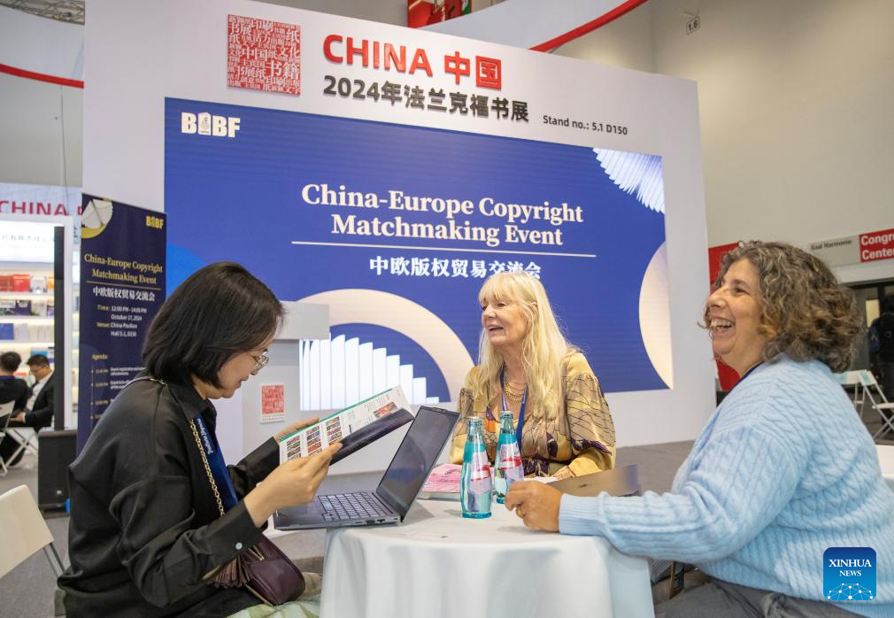 FRANKFURT, 17 octubre, 2024 (Xinhua) -- Visitantes conversan con una expositora durante el Evento de Emparejamiento sobre Derechos de Autor entre China y Europa en el área de exposiciones de editoriales chinas durante la 76 Feria del Libro de Frankfurt, en Frankfurt, Alemania, el 17 de octubre de 2024. La Feria del Libro de Frankfurt comenzó oficialmente el martes. Las editoriales chinas están causando un impacto significativo en la feria de este año, mostrando más de 3.500 libros, incluidos 1.500 en idiomas extranjeros. Además de los nuevos lanzamientos de libros, las editoriales chinas están celebrando numerosos estrenos y ceremonias de firma de acuerdos de derechos de autor, con hasta 1.000 libros disponibles para el comercio de derechos de autor. La feria también incluirá un evento promocional para la Feria Internacional del Libro de Beijing 2025 y una sesión sobre el comercio de derechos de autor entre China y Europa. (Xinhua/Zhang Fan)