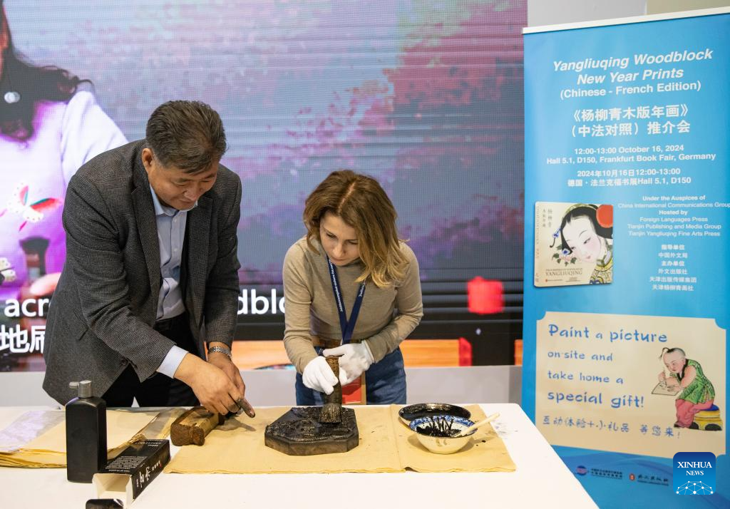 FRANKFURT, 17 octubre, 2024 (Xinhua) -- Imagen del 16 de octubre de 2024 de una visitante experimentando las habilidades de grabado de año nuevo con bloques de madera en el área de exposición de editoriales chinas durante la 76 Feria del Libro de Frankfurt, en Frankfurt, Alemania. La Feria del Libro de Frankfurt comenzó oficialmente el martes. Las editoriales chinas están causando un impacto significativo en la feria de este año, mostrando más de 3.500 libros, incluidos 1.500 en idiomas extranjeros. Además de los nuevos lanzamientos de libros, las editoriales chinas están celebrando numerosos estrenos y ceremonias de firma de acuerdos de derechos de autor, con hasta 1.000 libros disponibles para el comercio de derechos de autor. La feria también incluirá un evento promocional para la Feria Internacional del Libro de Beijing 2025 y una sesión sobre el comercio de derechos de autor entre China y Europa. (Xinhua/Zhang Fan)