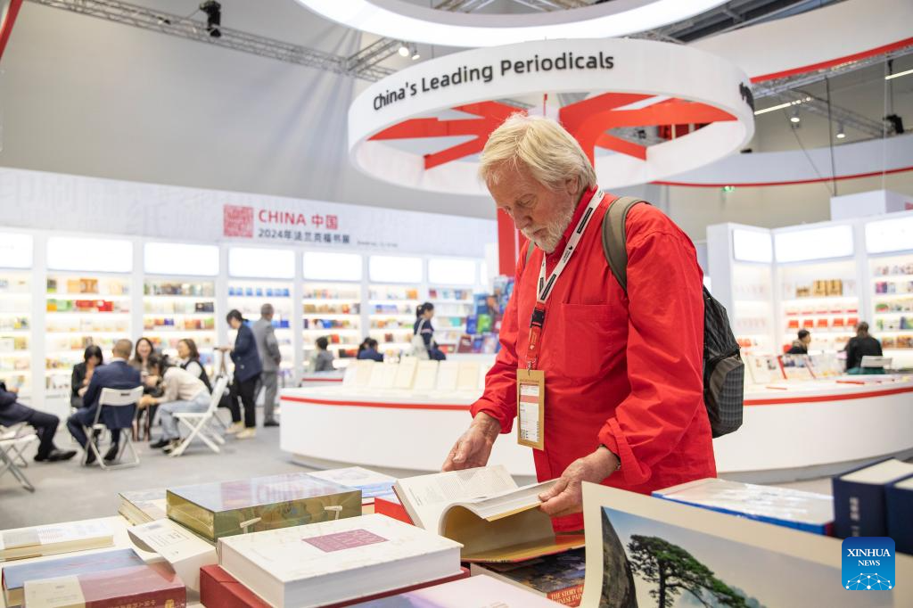 FRANKFURT, 17 octubre, 2024 (Xinhua) -- Un visitante observa un libro en el área de exposición de editoriales chinas durante la 76 Feria del Libro de Frankfurt, en Frankfurt, Alemania, el 17 de octubre de 2024. La Feria del Libro de Frankfurt comenzó oficialmente el martes. Las editoriales chinas están causando un impacto significativo en la feria de este año, mostrando más de 3.500 libros, incluidos 1.500 en idiomas extranjeros. Además de los nuevos lanzamientos de libros, las editoriales chinas están celebrando numerosos estrenos y ceremonias de firma de acuerdos de derechos de autor, con hasta 1.000 libros disponibles para el comercio de derechos de autor. La feria también incluirá un evento promocional para la Feria Internacional del Libro de Beijing 2025 y una sesión sobre el comercio de derechos de autor entre China y Europa. (Xinhua/Zhang Fan)