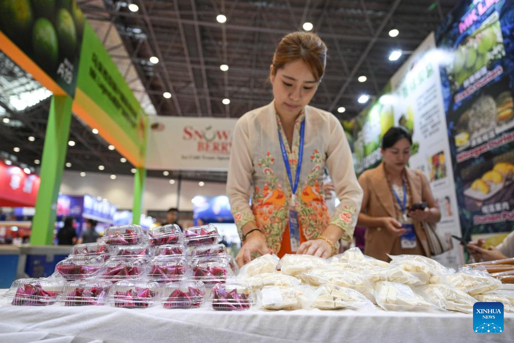 HAIKOU, 17 octubre, 2024 (Xinhua) -- Una trabajadora acomoda alimentos de Malasia durante la 2 Exposición Internacional de la Cadena de Suministro de Alimentos Tropicales de Hainan, en Haikou, en la provincia de Hainan, en el sur de China, el 17 de octubre de 2024. La 2 Exposición Internacional de la Cadena de Suministro de Alimentos Tropicales de Hainan comenzó aquí el jueves. (Xinhua/Pu Xiaoxu)