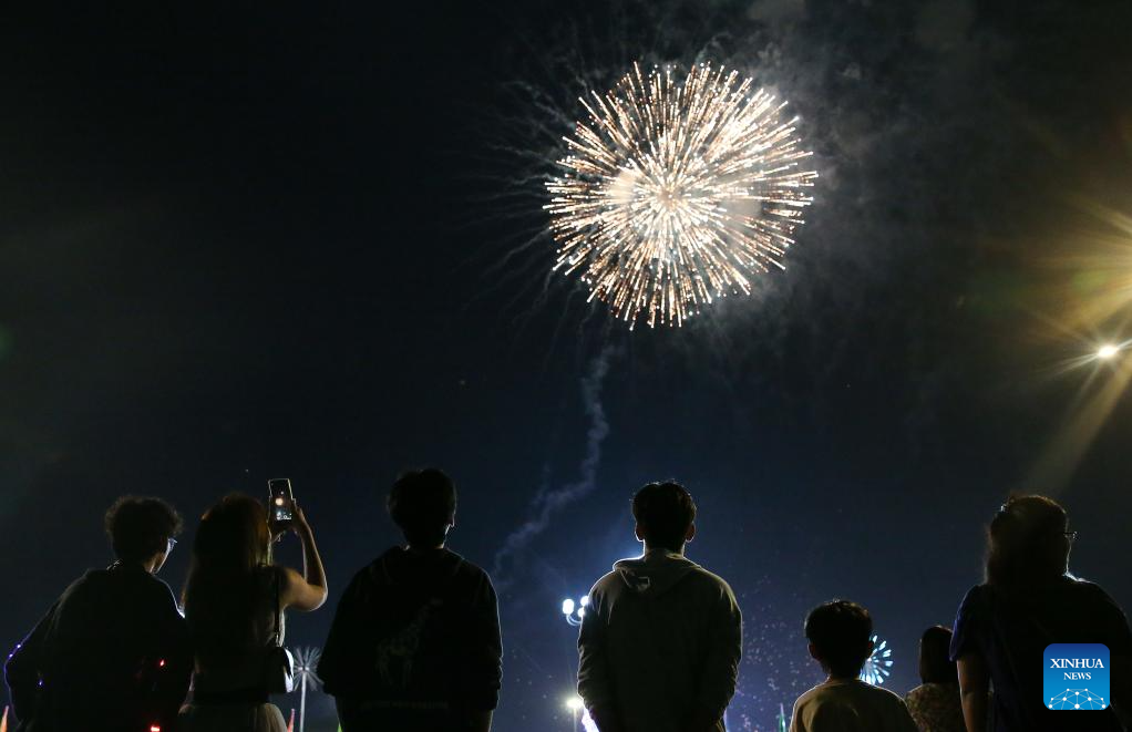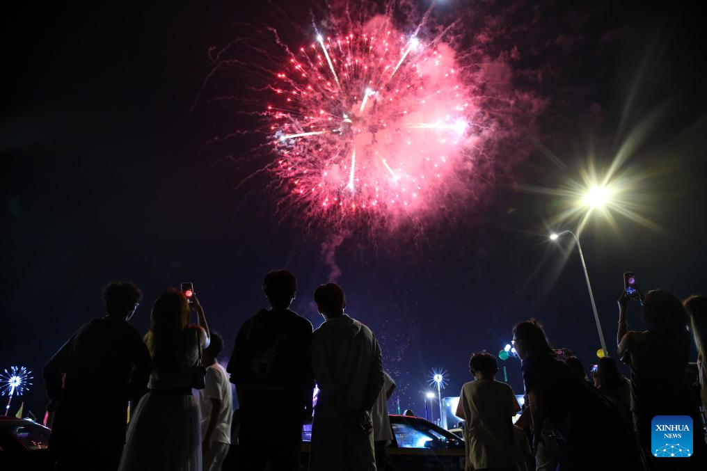 YANGON, 18 octubre, 2024 (Xinhua) -- Imagen del 17 de octubre de 2024 de personas observando un espectáculo de fuegos artificiales durante el Festival Thadingyut, en Yangón, Myanmar. El Festival Thadingyut, conocido como el festival de la iluminación, se celebra tradicionalmente durante tres días. (Xinhua/Myo Kyaw Soe)