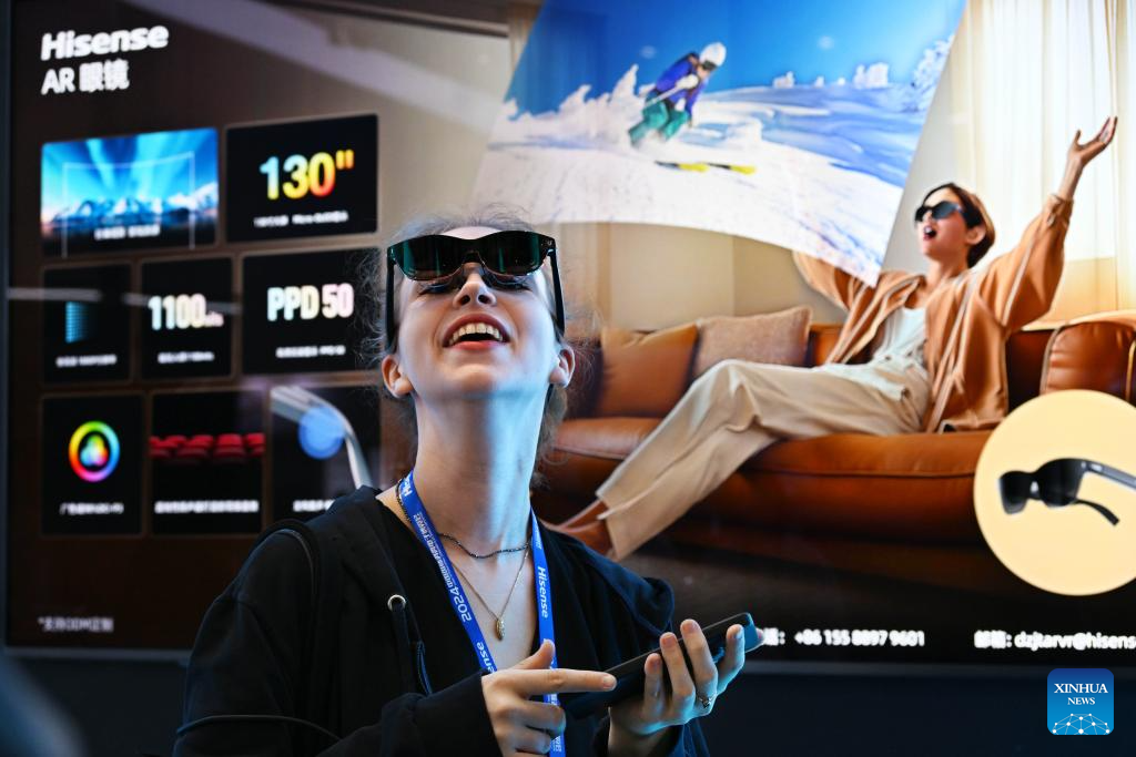 QINGDAO, 18 octubre, 2024 (Xinhua) -- Una mujer prueba un par de lentes de realidad aumentada durante la Exposición Internacional de Electrónica de Consumo de China 2024, en Qingdao, en la provincia de Shandong, en el este de China, el 18 de octubre de 2024. La exposición comenzó aquí el viernes. (Xinhua/Li Ziheng)