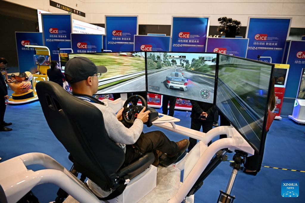 QINGDAO, 18 octubre, 2024 (Xinhua) -- Un hombre experimenta un juego de carreras de automovilismo virtual durante la Exposición Internacional de Electrónica de Consumo de China 2024, en Qingdao, en la provincia de Shandong, en el este de China, el 18 de octubre de 2024. La exposición comenzó aquí el viernes. (Xinhua/Li Ziheng)