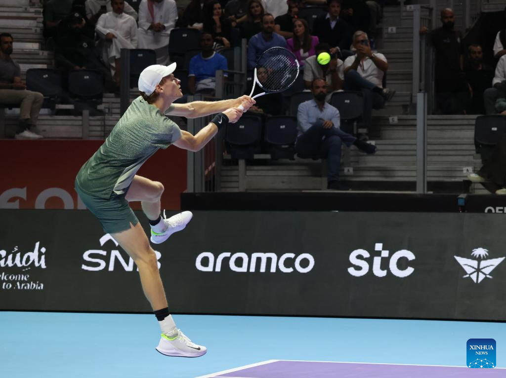 RIAD, 18 octubre, 2024 (Xinhua) -- Imagen del 17 de octubre de 2024 de Jannik Sinner, de Italia, devolviendo la pelota a Novak Djokovic, de Serbia, durante su partido de semifinal en el torneo de tenis de exhibición "Six Kings Slam", en Riad, Arabia Saudita. (Xinhua/Luo Chen)