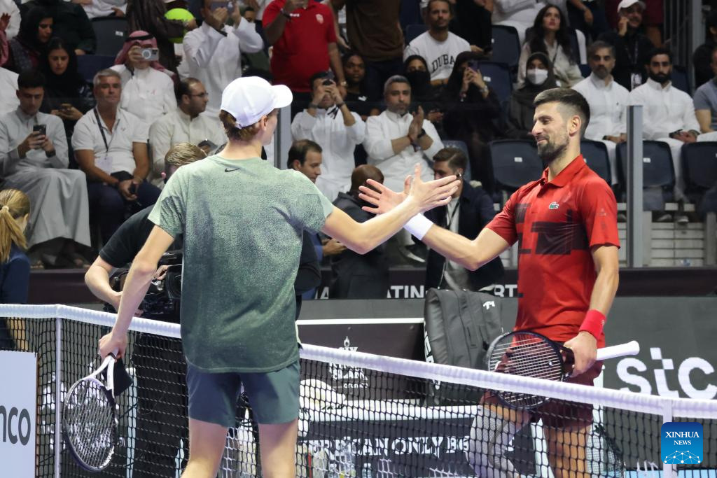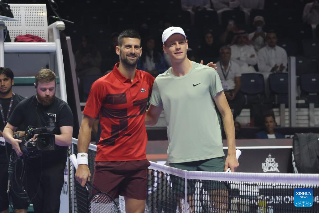 RIAD, 18 octubre, 2024 (Xinhua) -- Imagen del 17 de octubre de 2024 de Novak Djokovic (d), de Serbia, saludando a Jannik Sinner, de Italia, al término de su partido de semifinal en el torneo de tenis de exhibición "Six Kings Slam", en Riad, Arabia Saudita. (Xinhua/Luo Chen)
