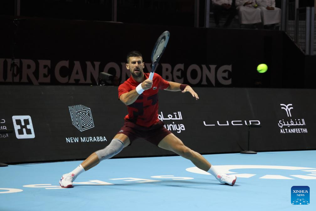 RIAD, 18 octubre, 2024 (Xinhua) -- Imagen del 17 de octubre de 2024 de Novak Djokovic, de Serbia, devolviendo la pelota a Jannik Sinner, de Italia, durante su partido de semifinal en el torneo de tenis de exhibición "Six Kings Slam", en Riad, Arabia Saudita. (Xinhua/Luo Chen)