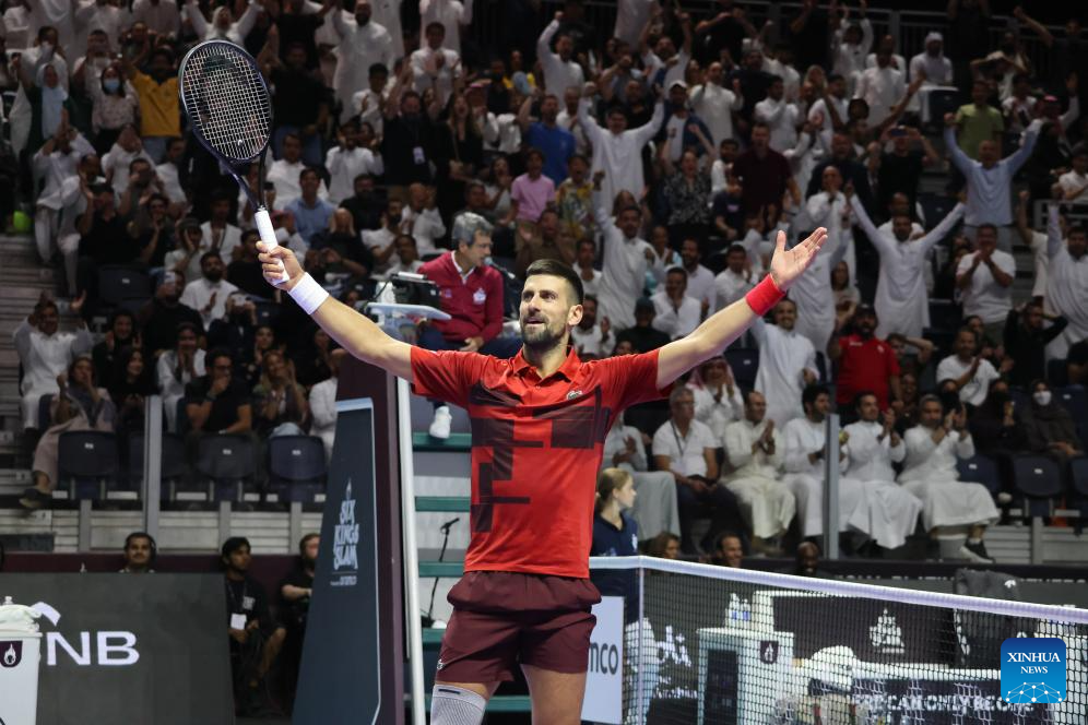 RIAD, 18 octubre, 2024 (Xinhua) -- Imagen del 17 de octubre de 2024 de Novak Djokovic, de Serbia, reaccionando durante el partido de semifinal ante Jannik Sinner, de Italia, en el torneo de tenis de exhibición "Six Kings Slam", en Riad, Arabia Saudita. (Xinhua/Luo Chen)