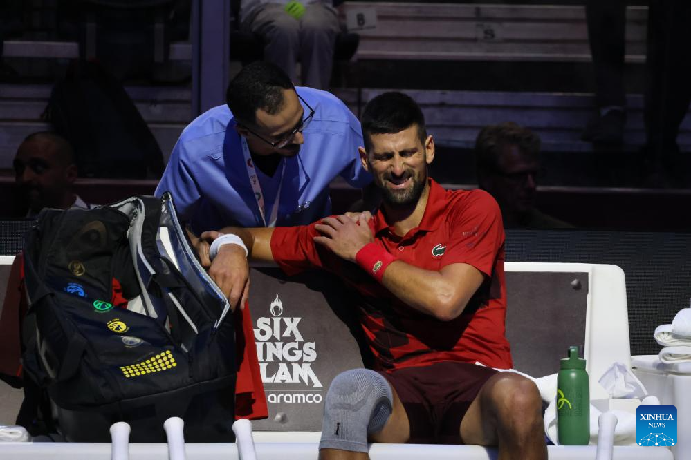 RIAD, 18 octubre, 2024 (Xinhua) -- Imagen del 17 de octubre de 2024 de Novak Djokovic (d), de Serbia, recibiendo atención médica durante el partido de semifinal ante Jannik Sinner, de Italia, en el torneo de tenis de exhibición "Six Kings Slam", en Riad, Arabia Saudita. (Xinhua/Luo Chen)