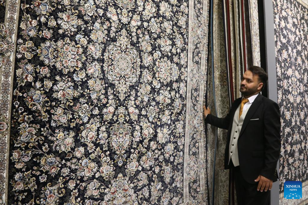 TEHERAN, 18 octubre, 2024 (Xinhua) -- Imagen del 17 de octubre de 2024 de un empleado mostrando productos durante la 16 Exposición Internacional de Revestimientos para Pisos, Moquetas, Alfombras Hechas a Máquina e Industrias Relacionadas, en Teherán, Irán. La exposición se llevó a cabo en Teherán del lunes al jueves. (Xinhua/Shadati)