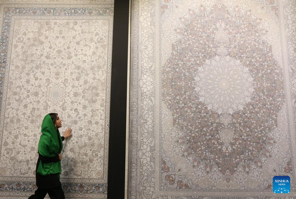 TEHERAN, 18 octubre, 2024 (Xinhua) -- Imagen del 17 de octubre de 2024 de una empleada mostrando productos durante la 16 Exposición Internacional de Revestimientos para Pisos, Moquetas, Alfombras Hechas a Máquina e Industrias Relacionadas, en Teherán, Irán. La exposición se llevó a cabo en Teherán del lunes al jueves. (Xinhua/Shadati)