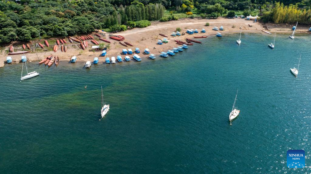 KUNMING, 18 octubre, 2024 (Xinhua) -- Vista aérea tomada con un dron del 20 de septiembre de 2024 de una base de navegación junto al lago Fuxian, en Yuxi, en la provincia de Yunnan, en el suroeste de China. Situada en la frontera suroccidental de China, la provincia de Yunnan cuenta con nueve grandes lagos de meseta incluidos el lago Dianchi, el lago Erhai, el lago Fuxian y el lago Lugu, etcétera. Con una superficie de 8,110 kilómetros cuadrados, la cuenca de estos lagos de meseta alberga más de 7 millones de personas. Hasta ahora, los nueve lagos de la meseta de la provincia han visto mejorar la calidad del agua en medio de continuos esfuerzos de restauración ecológica. (Xinhua/Hu Chao)