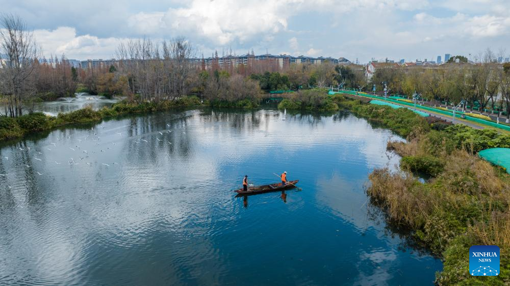 KUNMING, 18 octubre, 2024 (Xinhua) -- Vista aérea tomada con un dron del 16 de enero de 2024 de trabajadores limpiando basura en el lago Dianchi, en Kunming, en la provincia de Yunnan, en el suroeste de China. Situada en la frontera suroccidental de China, la provincia de Yunnan cuenta con nueve grandes lagos de meseta incluidos el lago Dianchi, el lago Erhai, el lago Fuxian y el lago Lugu, etcétera. Con una superficie de 8,110 kilómetros cuadrados, la cuenca de estos lagos de meseta alberga más de 7 millones de personas. Hasta ahora, los nueve lagos de la meseta de la provincia han visto mejorar la calidad del agua en medio de continuos esfuerzos de restauración ecológica. (Xinhua/Hu Chao)