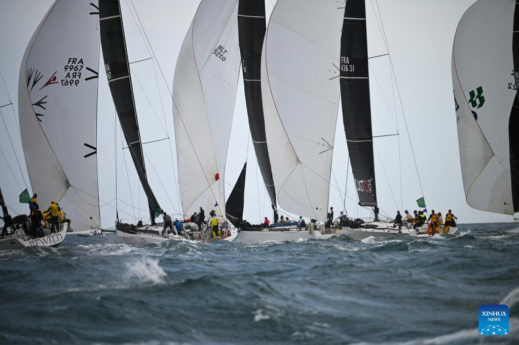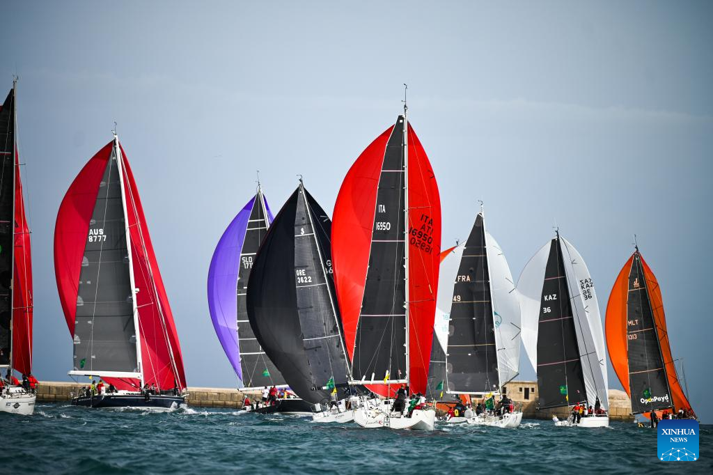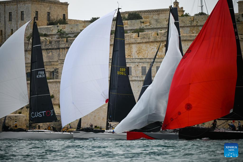 LA VALETA, 19 octubre, 2024 (Xinhua) -- Veleros compiten durante la 45 Rolex Middle Sea Race (2024) en el Gran Puerto, en La Valeta, Malta, el 19 de octubre de 2024. (Xinhua/Jonathan Borg)