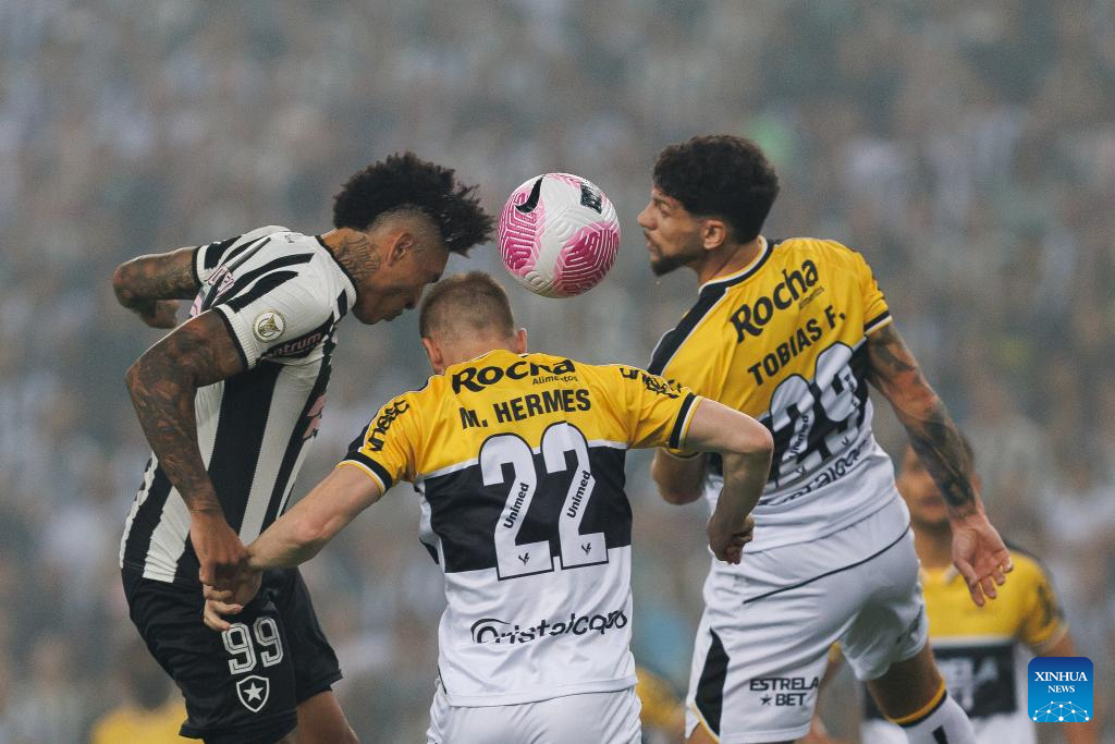 RIO DE JANEIRO, 19 octubre, 2024 (Xinhua) -- Imagen del 18 de octubre de 2024 del jugador Igor Jesus (i), de Botafogo, disputando el balón con Marcelo Hermes (c) y Tobias Figueiredo (d), de Criciúma, durante el partido correspondiente a la jornada 30 del Campeonato Brasileño Serie A, celebrado en el Estadio Maracaná, en Río de Janeiro, Brasil. (Xinhua/Claudia Martini)