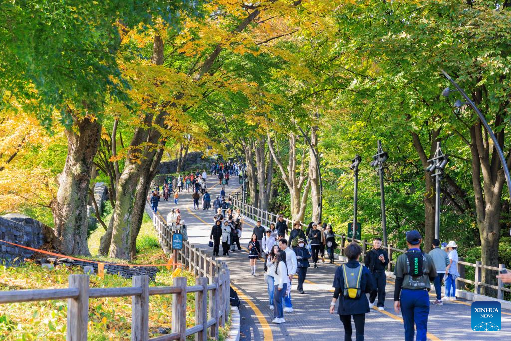 SEUL, 20 octubre, 2024 (Xinhua) -- Personas disfrutan del paisaje otoñal en el parque Namsan, en Seúl, República de Corea, el 20 de octubre de 2024. (Xinhua/JINTAEK)
