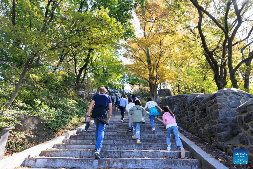 SEUL, 20 octubre, 2024 (Xinhua) -- Personas suben la montaña en el parque Namsan, en Seúl, República de Corea, el 20 de octubre de 2024. (Xinhua/JINTAEK)
