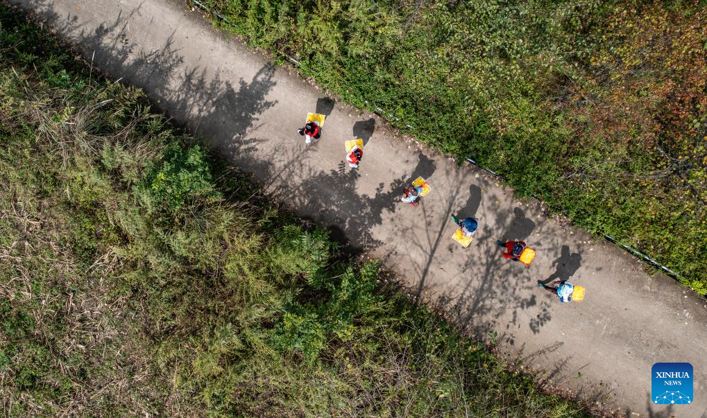 LIUPANSHUI, 20 octubre, 2024 (Xinhua) -- Vista aérea tomada con un dron del 19 de octubre de 2024 de trabajadores cargando flores de crisantemo cosechadas en una base de plantación, en el poblado de Dawan de Liupanshui, en la provincia de Guizhou, en el suroeste de China. La temporada de cosecha de flores de crisantemo ha llegado recientemente a Liupanshui. En los últimos años, en Liupanshui se han fomentado las industrias relacionadas con las flores de crisantemo para aumentar los ingresos de la población local. (Xinhua/Tao Liang)