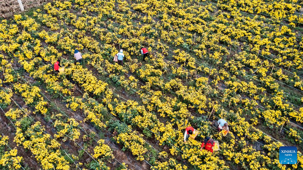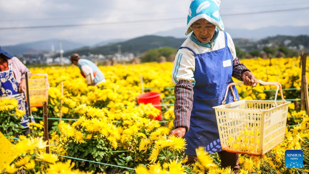 Llega temporada de cosecha de flores de crisantemo en suroeste de China