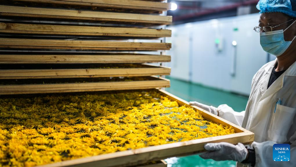 LIUPANSHUI, 20 octubre, 2024 (Xinhua) -- Imagen del 19 de octubre de 2024 de un trabajador revisando el estado de secado de las flores de crisantemo en un taller de procesamiento, en el poblado de Dawan de Liupanshui, en la provincia de Guizhou, en el suroeste de China. La temporada de cosecha de flores de crisantemo ha llegado recientemente a Liupanshui. En los últimos años, en Liupanshui se han fomentado las industrias relacionadas con las flores de crisantemo para aumentar los ingresos de la población local. (Xinhua/Tao Liang)