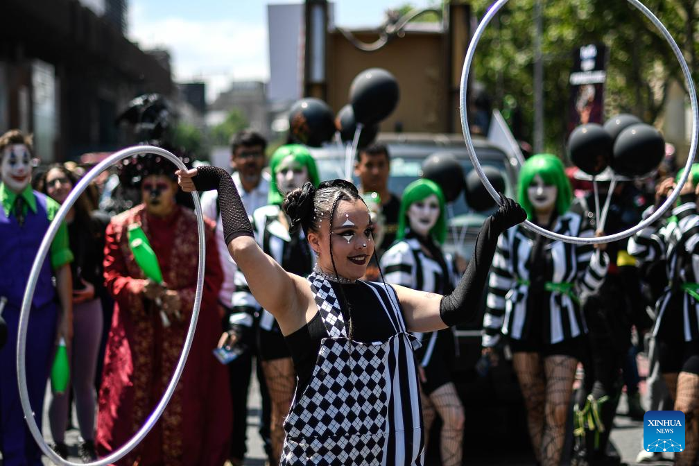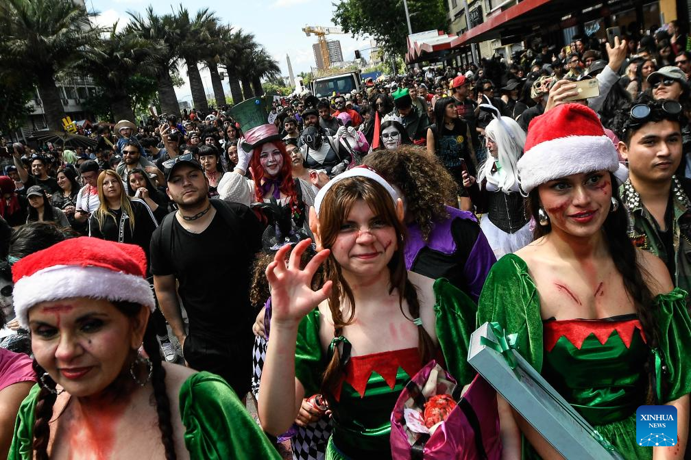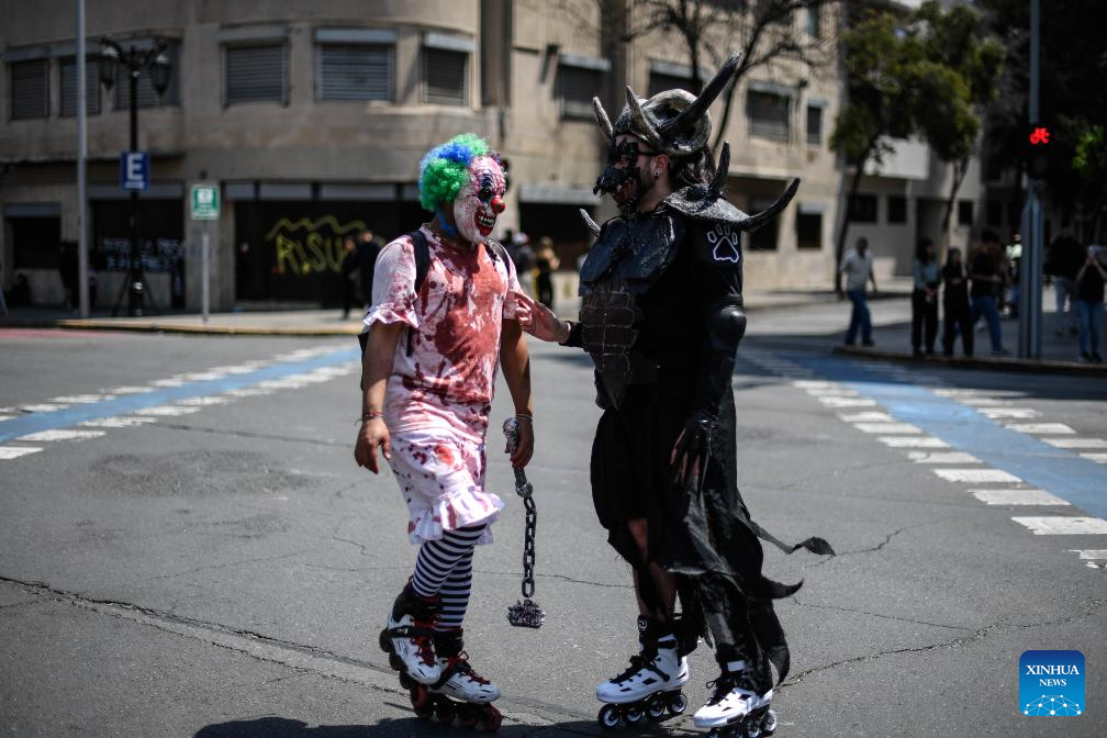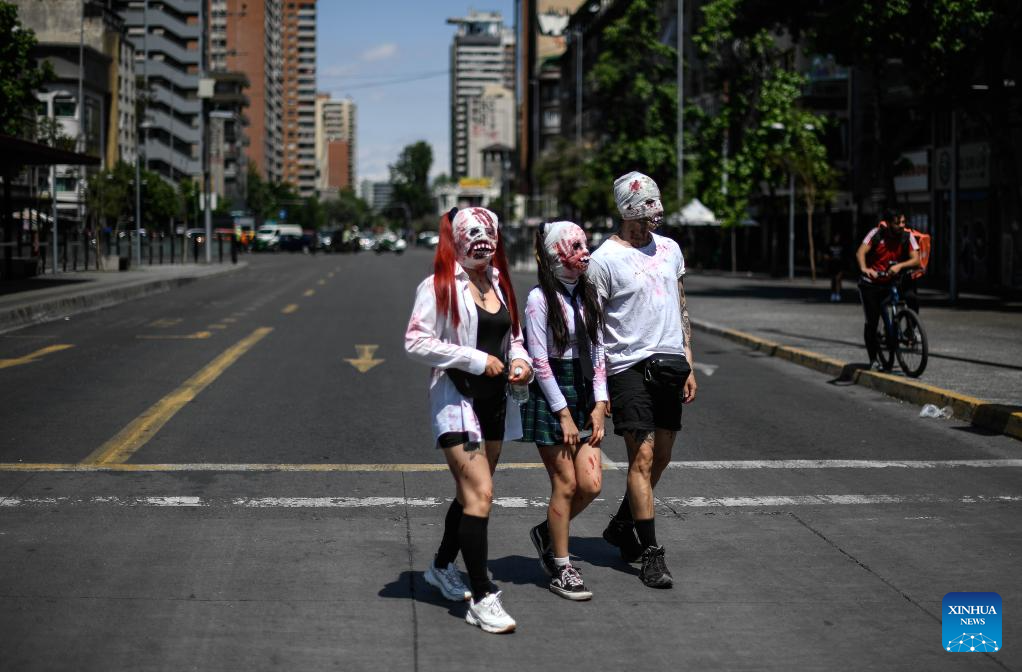 SANTIAGO, 20 octubre, 2024 (Xinhua)-- Personas disfrazadas participan en el evento "Zombie Walk 2024", en la ciudad de Santiago, capital de Chile, el 20 de octubre de 2024. (Xinhua/Jorge Villegas)
