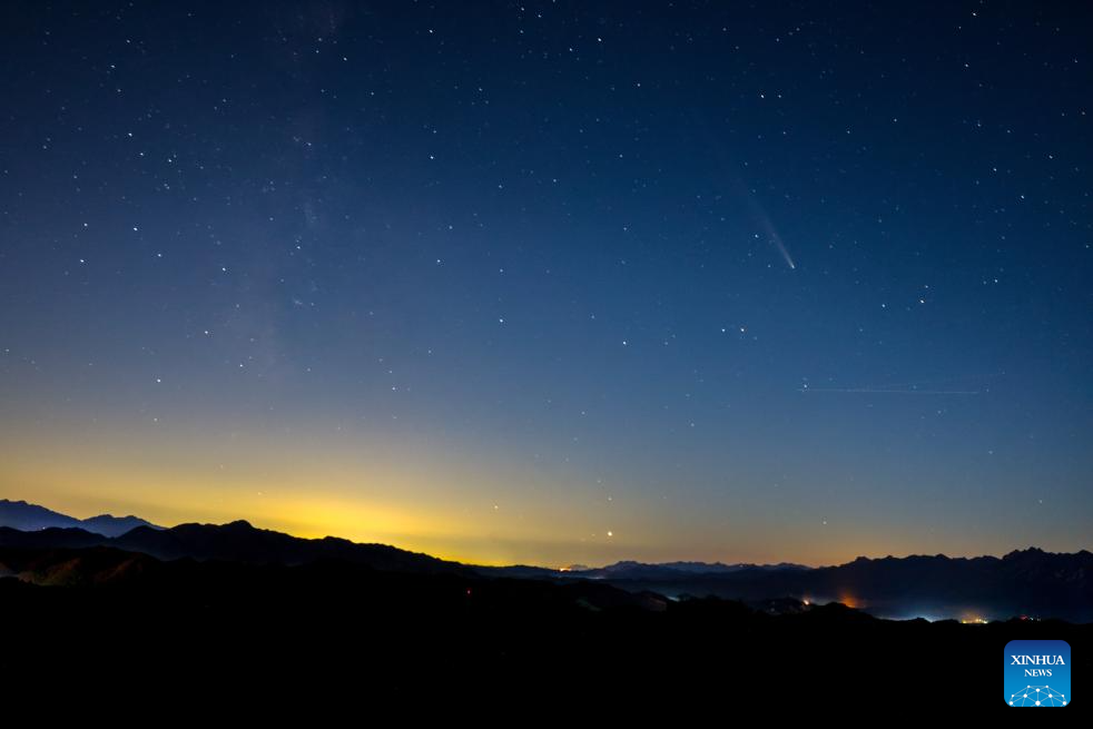 BEIJING, 20 octubre, 2024 (Xinhua) -- Imagen del 19 de octubre de 2024 del cometa C/2023 A3 (Tsuchinshan-ATLAS) visto en el cielo sobre la sección Panlongshan de la Gran Muralla, en Beijing, capital de China. El cometa fue visto por primera vez el 9 de enero de 2023 por astrónomos en el Observatorio de Montaña Púrpura adscrito a la Academia de Ciencias de China. El descubrimiento fue confirmado por el Centro de Planetas Menores de la Unión Astronómica Internacional y fue nombrado Tsuchinshan-ATLAS. El cometa gira alrededor del Sol en una órbita ovalada especial, y pasarían otros 61.751 años antes de que los humanos en la Tierra lo vieran nuevamente a simple vista. (Xinhua/Ou Dongqu)