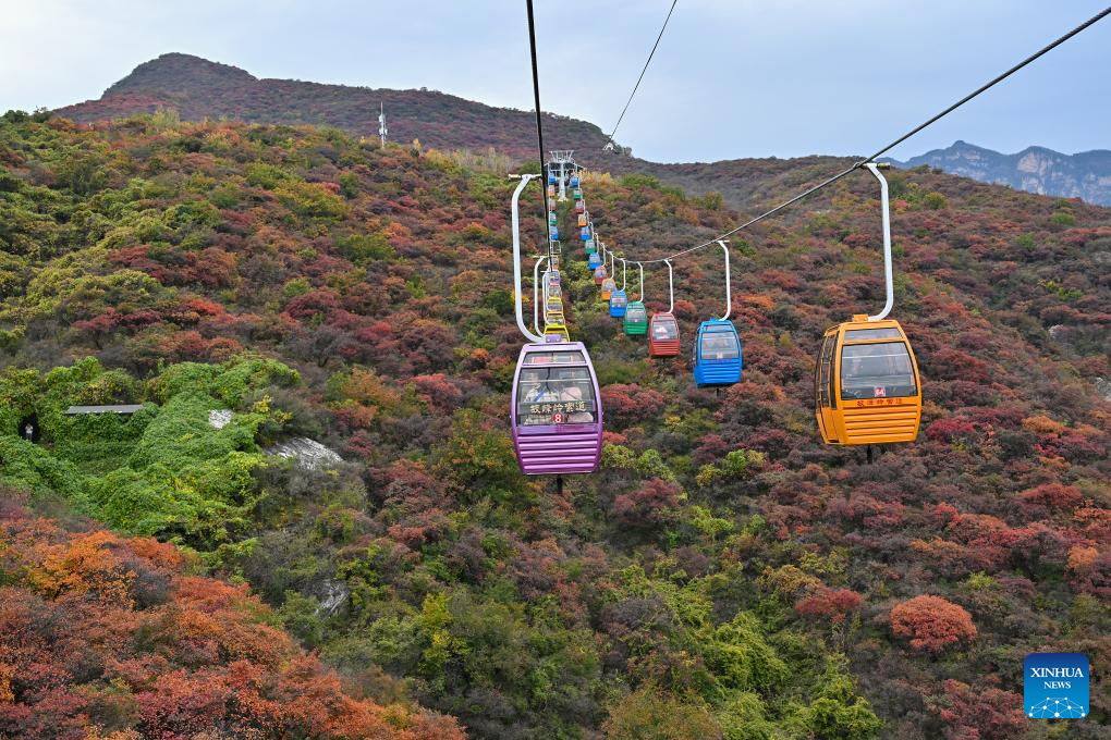 BEIJING, 20 octubre, 2024 (Xinhua) -- Personas viajan a bordo de teleféricos para disfrutar el paisaje de otoño en el Area Escénica de Pofengling, en el distrito de Fangshan de Beijing, el 20 de octubre de 2024. (Xinhua/Li Xin)