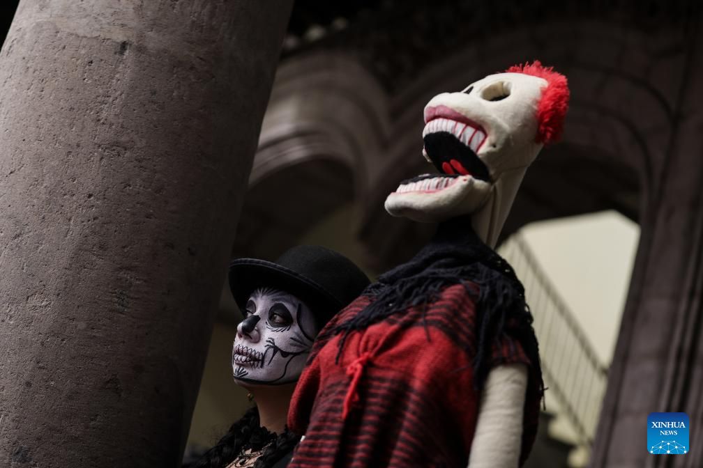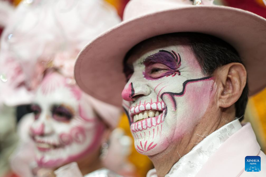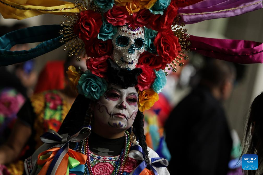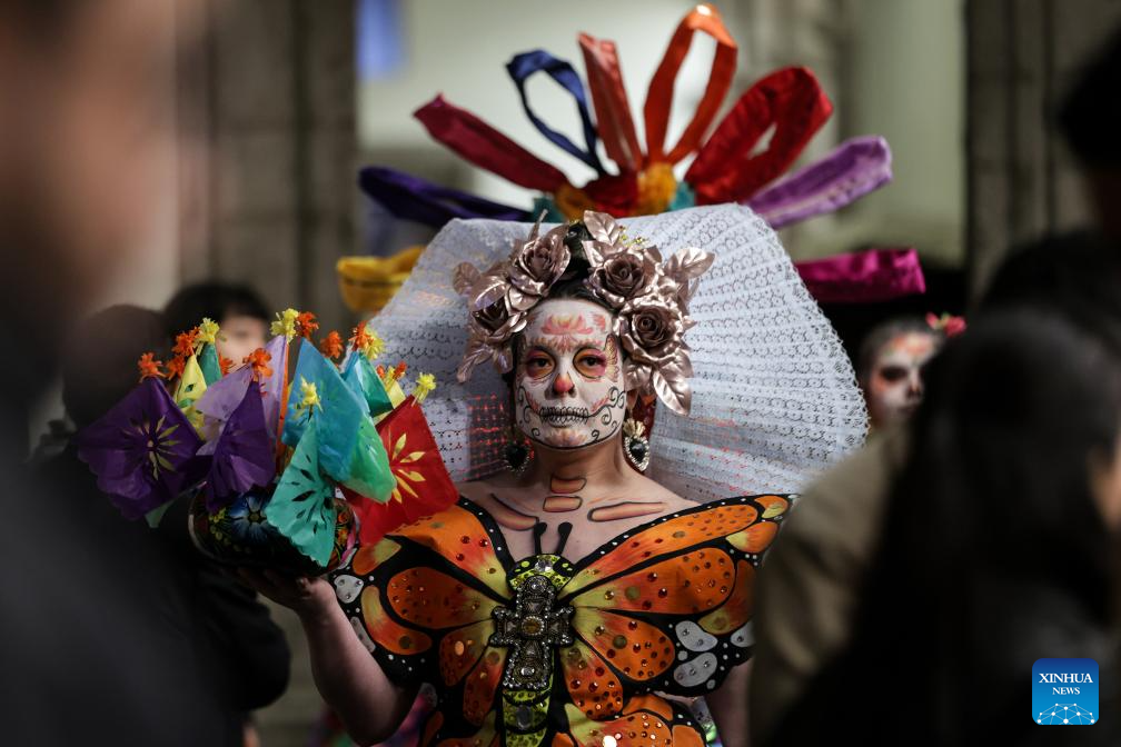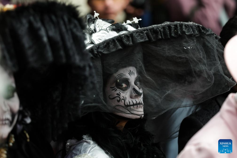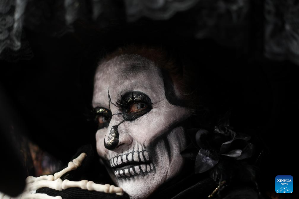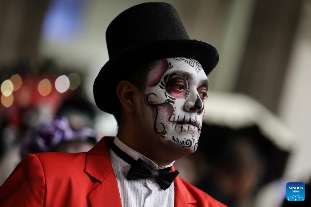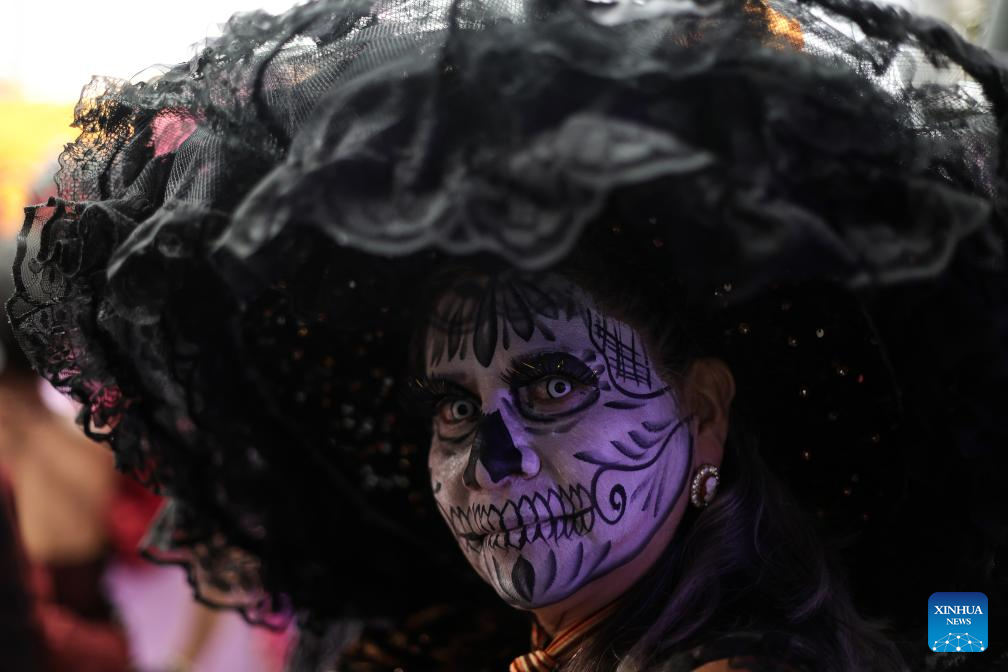 CIUDAD DE MEXICO, 21 octubre, 2024 (Xinhua) -- Una mujer caracterizada como una catrina participa en la presentación de actividades por el "Día de Muertos en la Ciudad de México 2024", en la Ciudad de México, capital de México, el 21 de octubre de 2024. (Xinhua/Francisco Cañedo)