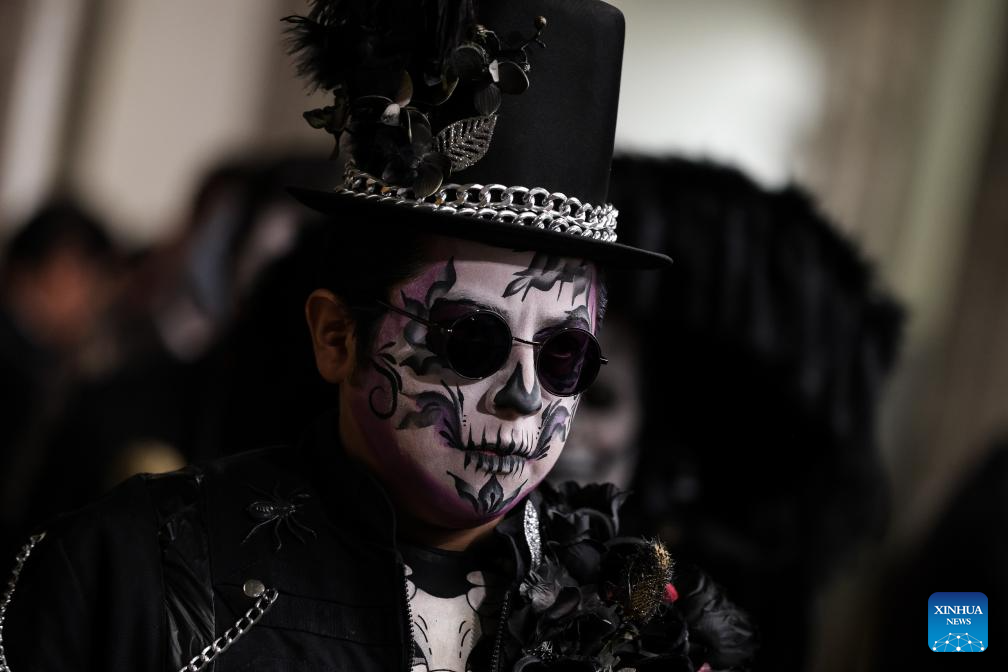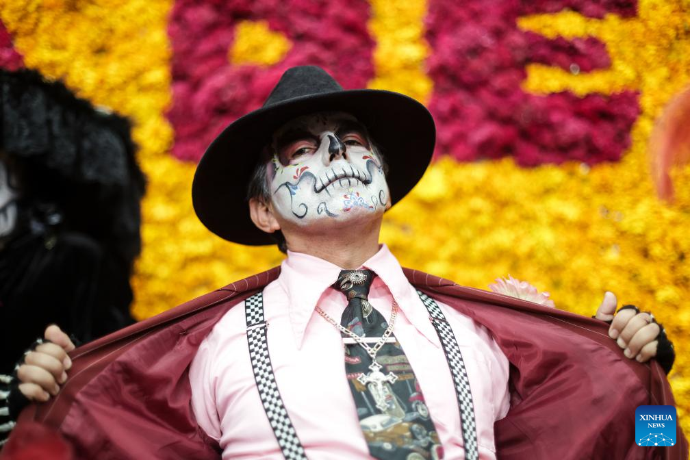 CIUDAD DE MEXICO, 21 octubre, 2024 (Xinhua) -- Un hombre caracterizado como catrín participa en la presentación de actividades por el "Día de Muertos en la Ciudad de México 2024", en la Ciudad de México, capital de México, el 21 de octubre de 2024. (Xinhua/Francisco Cañedo)