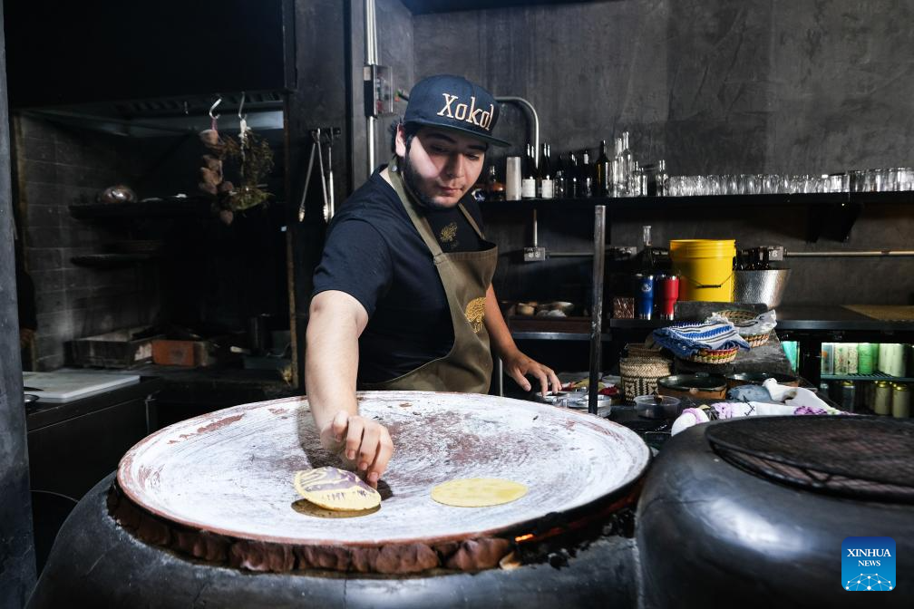 JALISCO, 21 octubre, 2024 (Xinhua) -- Imagen del 28 de septiembre de 2024 de un chef preparando tortillas en un comal especial para estampar tortillas con muicle en el restaurante de comida mexicana Xokol, en Guadalajara, estado de Jalisco, México. El dulce aroma del maíz y del chile asado en comales de barro, fogones, y una mesa larga, en la que los comensales comparten deliciosos alimentos inspirados en la cocina ancestral mexicana, forman parte de Xokol, un espacio donde el acto de comer se convierte en un ritual. (Xinhua/Diana Márquez)