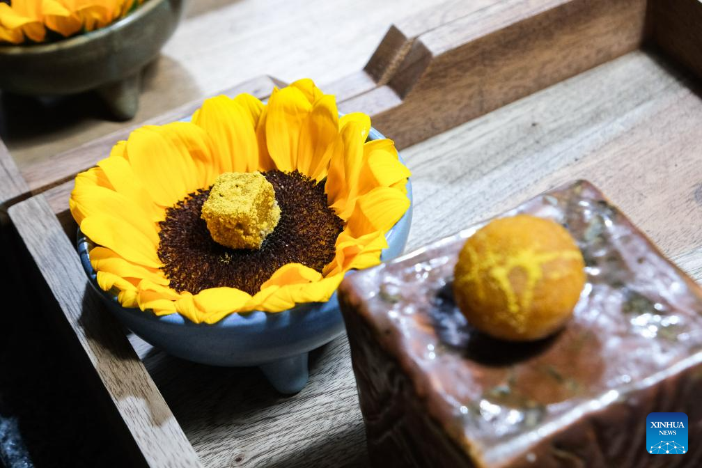 JALISCO, 21 octubre, 2024 (Xinhua) -- Imagen del 28 de septiembre de 2024 de de un platillo servido sobre una flor de girasol en el restaurante de comida mexicana Xokol, en Guadalajara, estado de Jalisco, México. El dulce aroma del maíz y del chile asado en comales de barro, fogones, y una mesa larga, en la que los comensales comparten deliciosos alimentos inspirados en la cocina ancestral mexicana, forman parte de Xokol, un espacio donde el acto de comer se convierte en un ritual. (Xinhua/Diana Márquez)