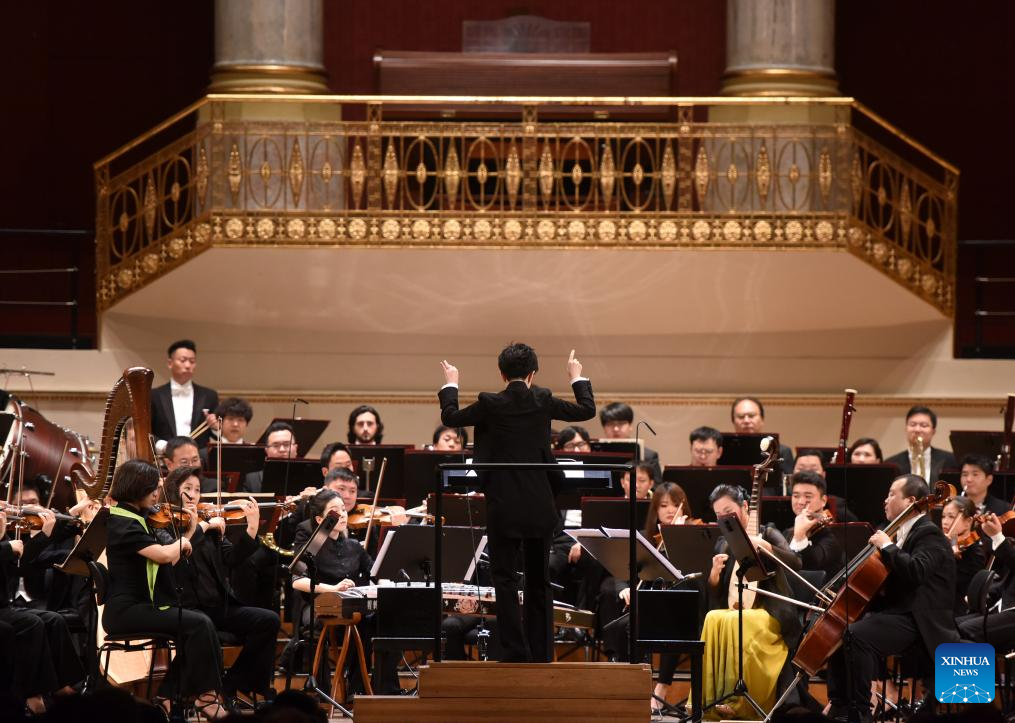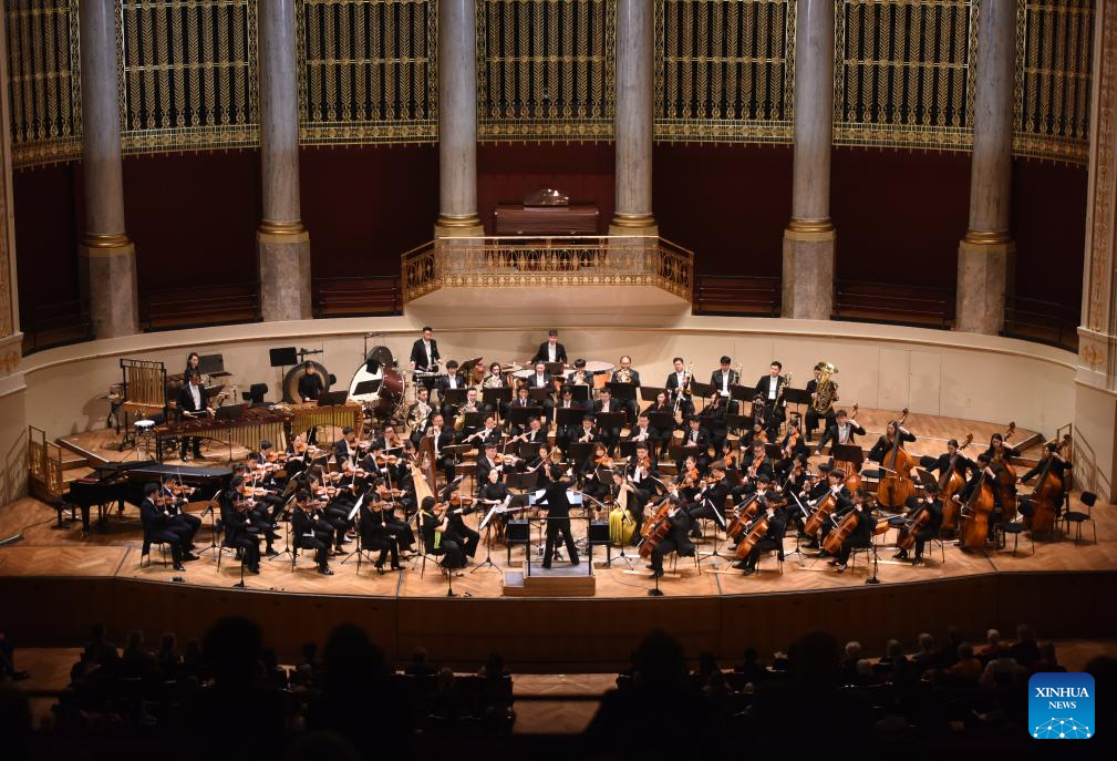 VIENA, 21 octubre, 2024 (Xinhua) -- Imagen del 20 de octubre de 2024 de un concierto sinfónico ofrecido por la orquesta sinfónica del Conservatorio Central de Música de China, en Viena, Austria. (Xinhua/He Canling)