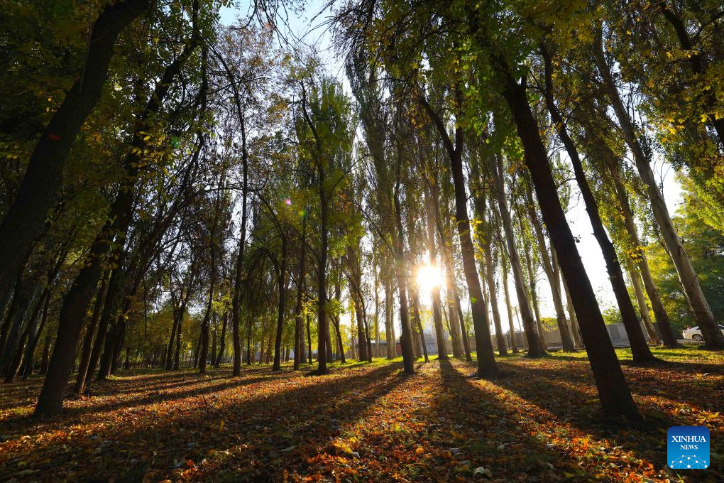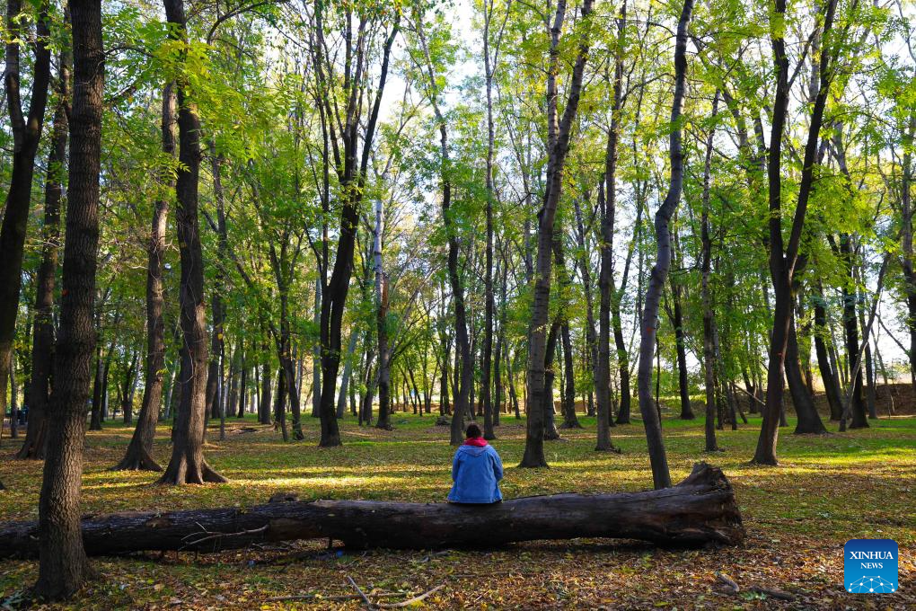 BISHKEK, 21 octubre, 2024 (Xinhua) -- Imagen del 19 de octubre de 2024 de un ciudadano disfrutando el paisaje de otoño, en las afueras de Bishkek, Kirguistán. (Xinhua/Roman Gainanov)