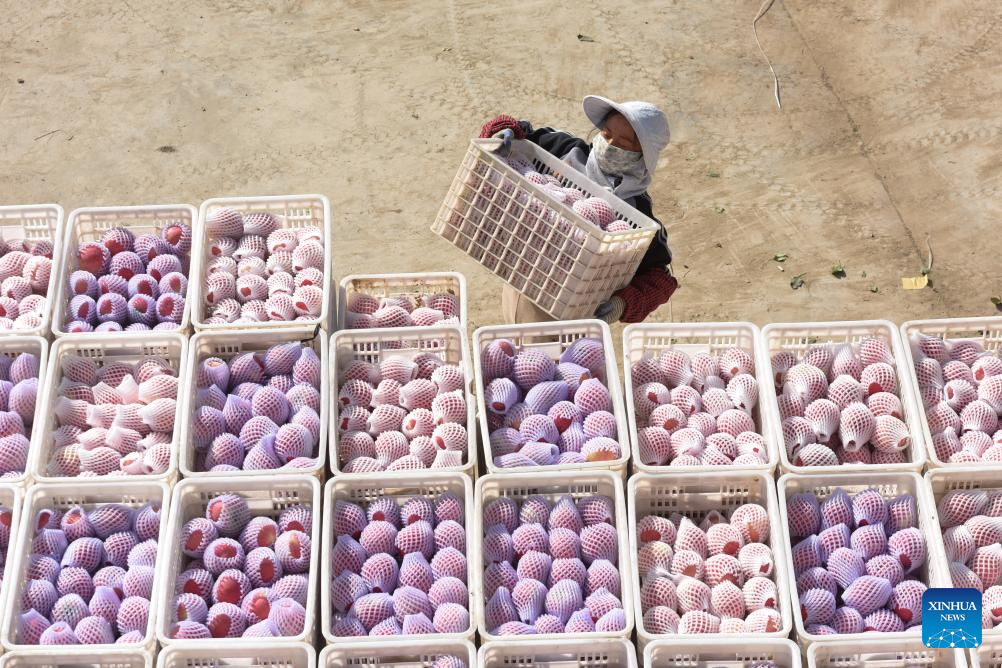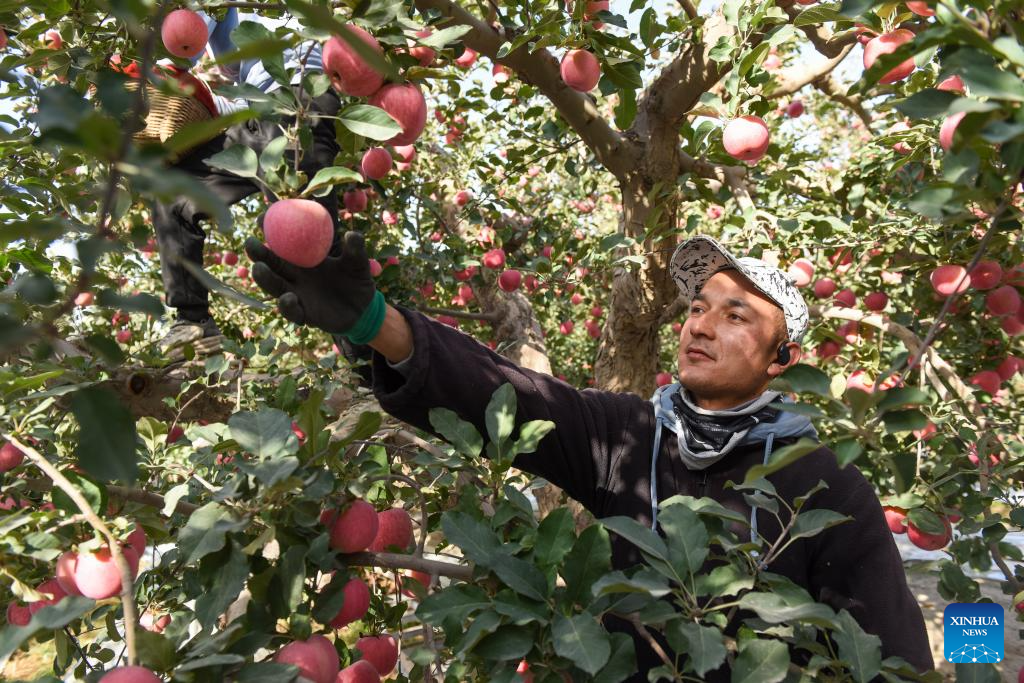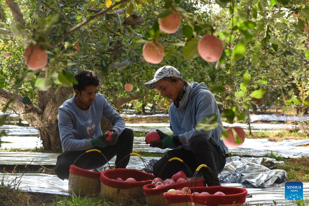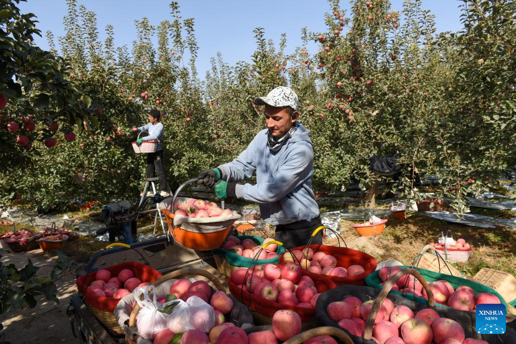 AKSU, 23 octubre, 2024 (Xinhua) -- Trabajadores de un huerto cosechan manzanas, en Aksu, en la región autónoma uygur de Xinjiang, en el noroeste de China, el 23 de octubre de 2024. Gracias a la posición geológica de Aksu, al clima y a las largas horas de sol, las manzanas de Aksu ganaron gran popularidad entre los clientes. (Xinhua/Gao Han)