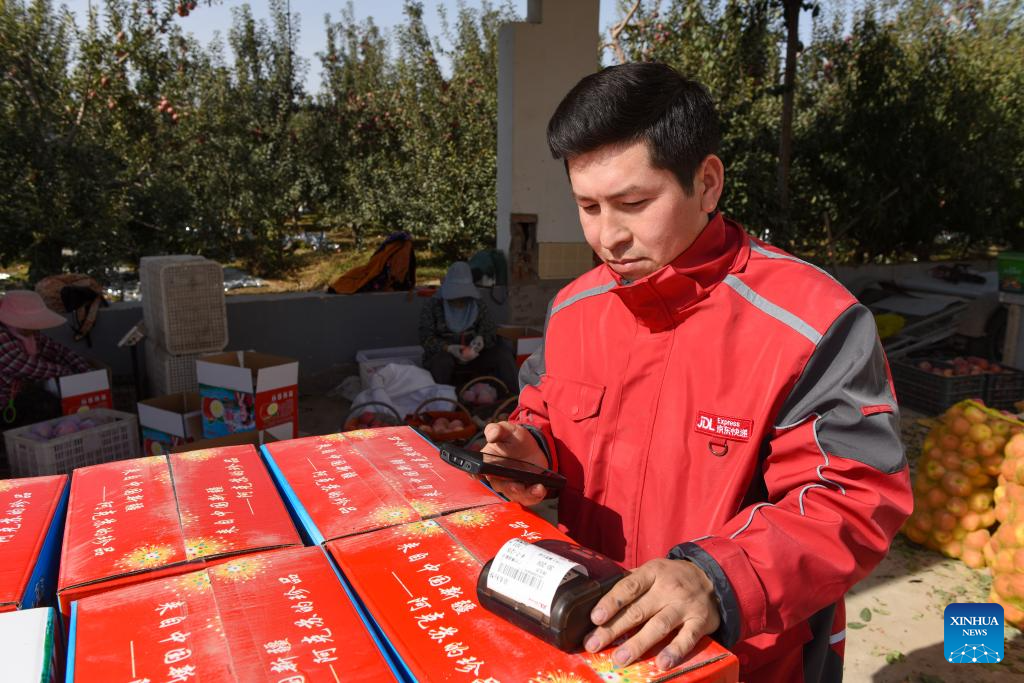 AKSU, 23 octubre, 2024 (Xinhua) -- Un repartidor prepara cajas de manzanas, en Aksu, en la región autónoma uygur de Xinjiang, en el noroeste de China, el 23 de octubre de 2024. Gracias a la posición geológica de Aksu, al clima y a las largas horas de sol, las manzanas de Aksu ganaron gran popularidad entre los clientes. (Xinhua/Gao Han)