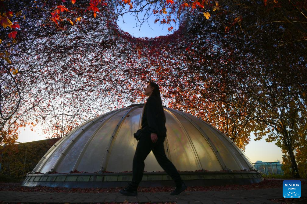 VARSOVIA, 23 octubre, 2024 (Xinhua) -- Image del 22 de octubre de 2024 de una visitante caminando por el jardín en la azotea de la Biblioteca de la Universidad de Varsovia, en Varsovia, Polonia. El jardín en la azotea de la Biblioteca de la Universidad de Varsovia es uno de los jardines de azotea más grandes de Europa y un lugar popular para contemplar las vistas de la ciudad. (Xinhua/Jaap Arriens)