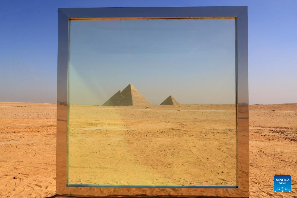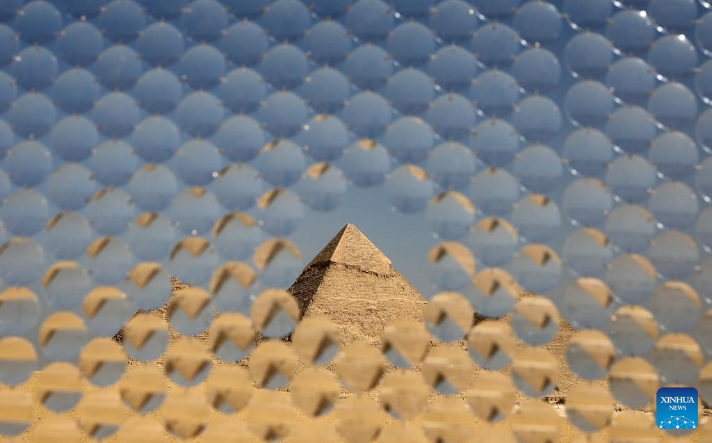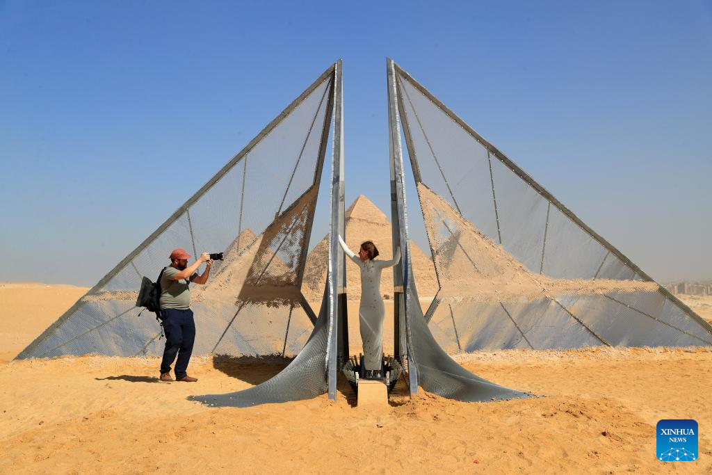 GIZA, 24 octubre, 2024 (Xinhua) -- La pirámide es vista a través de una instalación artística presentada durante la exposición internacional de arte "Por Siempre es Ahora" en el punto escénico de las Pirámides de Giza, en Giza, Egipto, el 24 de octubre de 2024. La cuarta edición de la exposición internacional de arte "Por Siempre es Ahora" inició el jueves en el área del punto escénico de las Pirámides de Giza de Egipto, presentando 12 obras de arte de artistas de diferentes países. La exposición se llevará a cabo del 24 de octubre al 16 de noviembre. (Xinhua/Wang Dongzhen)