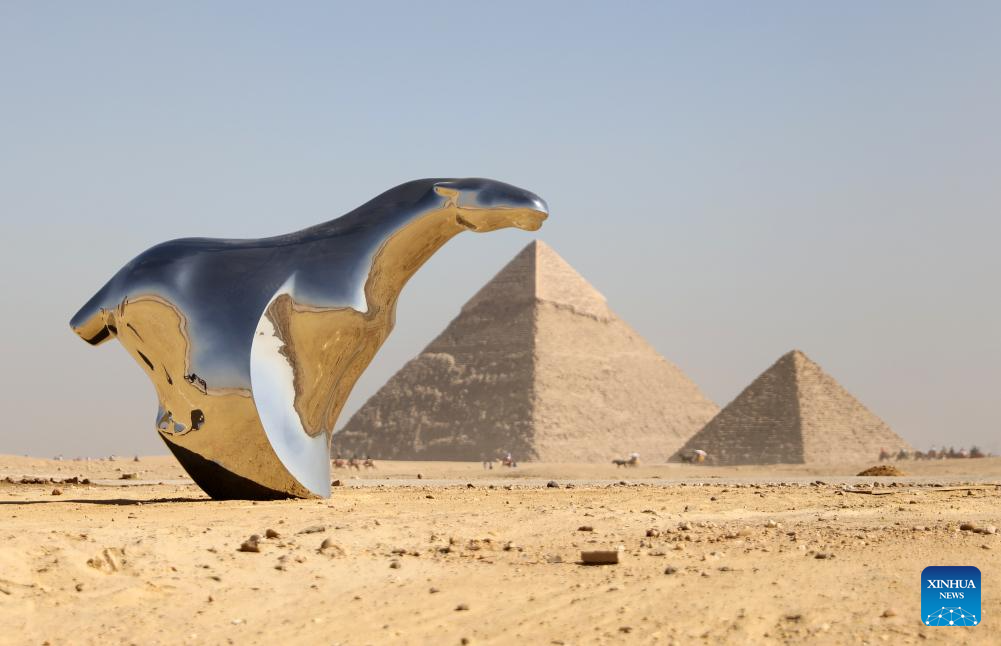 GIZA, 24 octubre, 2024 (Xinhua) -- Una instalación artística es presentada durante la exposición internacional de arte "Por Siempre es Ahora" en el punto escénico de las Pirámides de Giza, en Giza, Egipto, el 24 de octubre de 2024. La cuarta edición de la exposición internacional de arte "Por Siempre es Ahora" inició el jueves en el área del punto escénico de las Pirámides de Giza de Egipto, presentando 12 obras de arte de artistas de diferentes países. La exposición se llevará a cabo del 24 de octubre al 16 de noviembre. (Xinhua/Sui Xiankai)