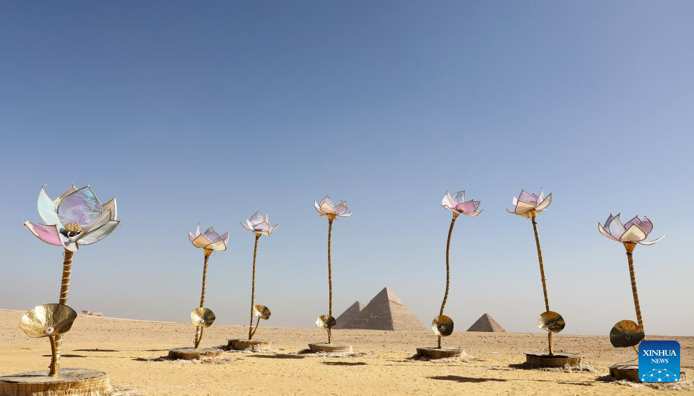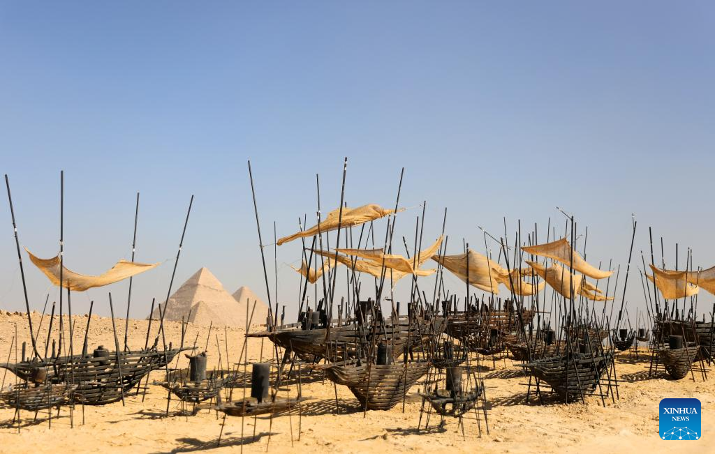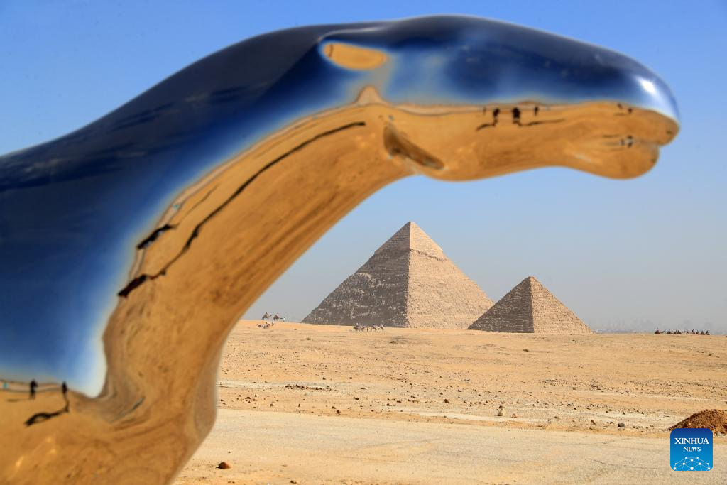 GIZA, 24 octubre, 2024 (Xinhua) -- Instalaciones artísticas son presentadas durante la exposición internacional de arte "Por Siempre es Ahora" en el punto escénico de las Pirámides de Giza, en Giza, Egipto, el 24 de octubre de 2024. La cuarta edición de la exposición internacional de arte "Por Siempre es Ahora" inició el jueves en el área del punto escénico de las Pirámides de Giza de Egipto, presentando 12 obras de arte de artistas de diferentes países. La exposición se llevará a cabo del 24 de octubre al 16 de noviembre. (Xinhua/Wang Dongzhen)