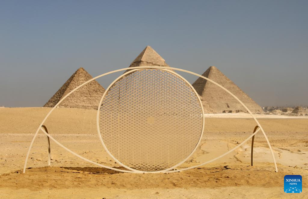 GIZA, 24 octubre, 2024 (Xinhua) -- Una instalación artística es presentada durante la exposición internacional de arte "Por Siempre es Ahora" en el punto escénico de las Pirámides de Giza, en Giza, Egipto, el 24 de octubre de 2024. La cuarta edición de la exposición internacional de arte "Por Siempre es Ahora" inició el jueves en el área del punto escénico de las Pirámides de Giza de Egipto, presentando 12 obras de arte de artistas de diferentes países. La exposición se llevará a cabo del 24 de octubre al 16 de noviembre. (Xinhua/Wang Dongzhen)