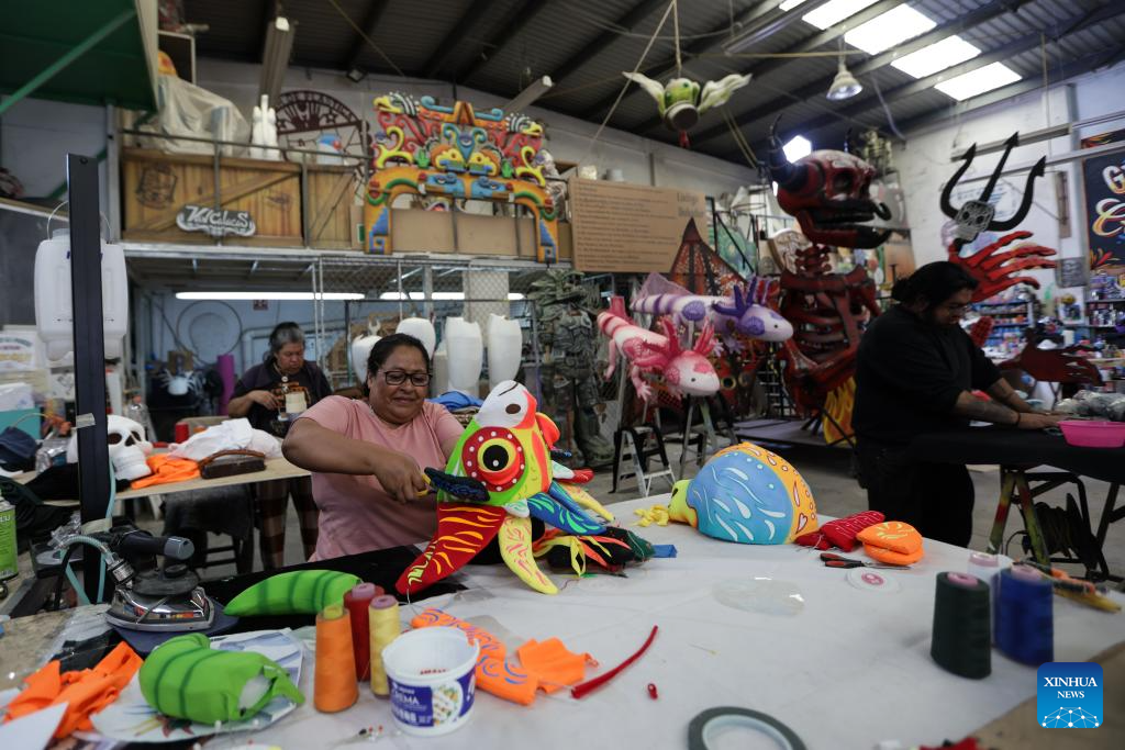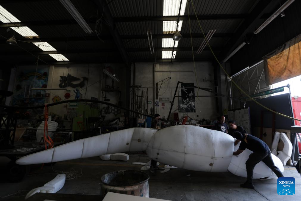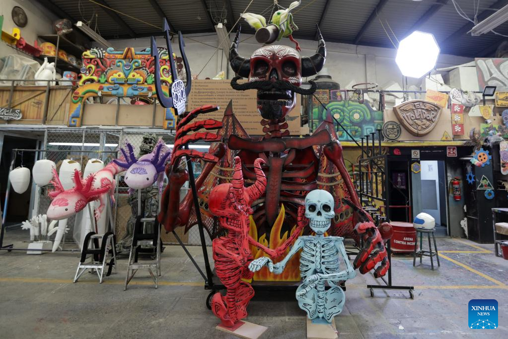 CIUDAD DE MEXICO, 24 octubre, 2024 (Xinhua) -- Imagen del 23 de octubre de 2024 de piezas de carros alegóricos vistas durante los preparativos para el Gran Desfile de Día de Muertos 2024, en el Taller El Volador, en la Ciudad de México, capital de México. (Xinhua/Francisco Cañedo)